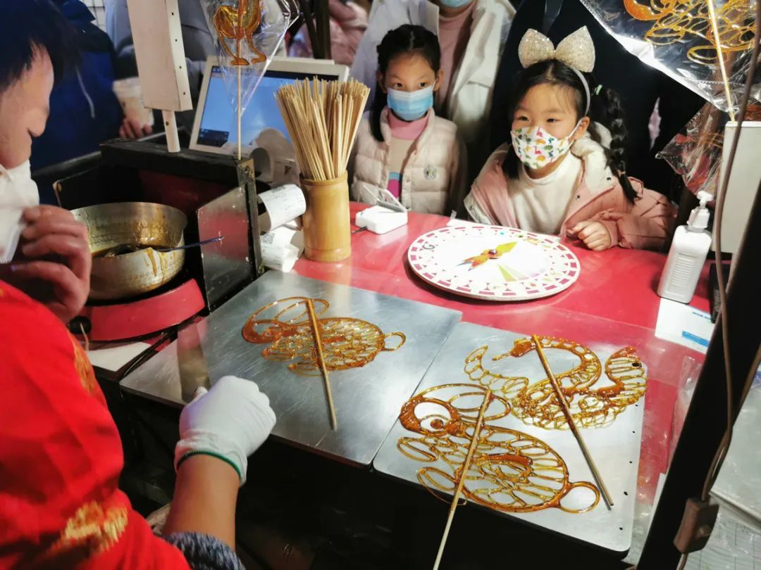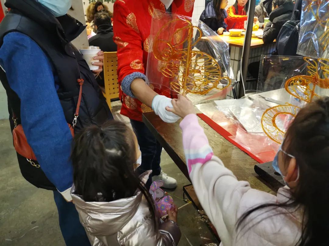 来福士城市集市画糖画的摊位围满了人。十分钟不到,摊主就卖出了三只“小兔子”。