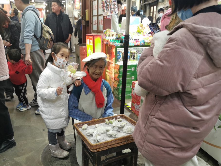 另一位小姑娘手拿兔子“吹糖人”,与白兰花阿婆“咔嚓”一张。