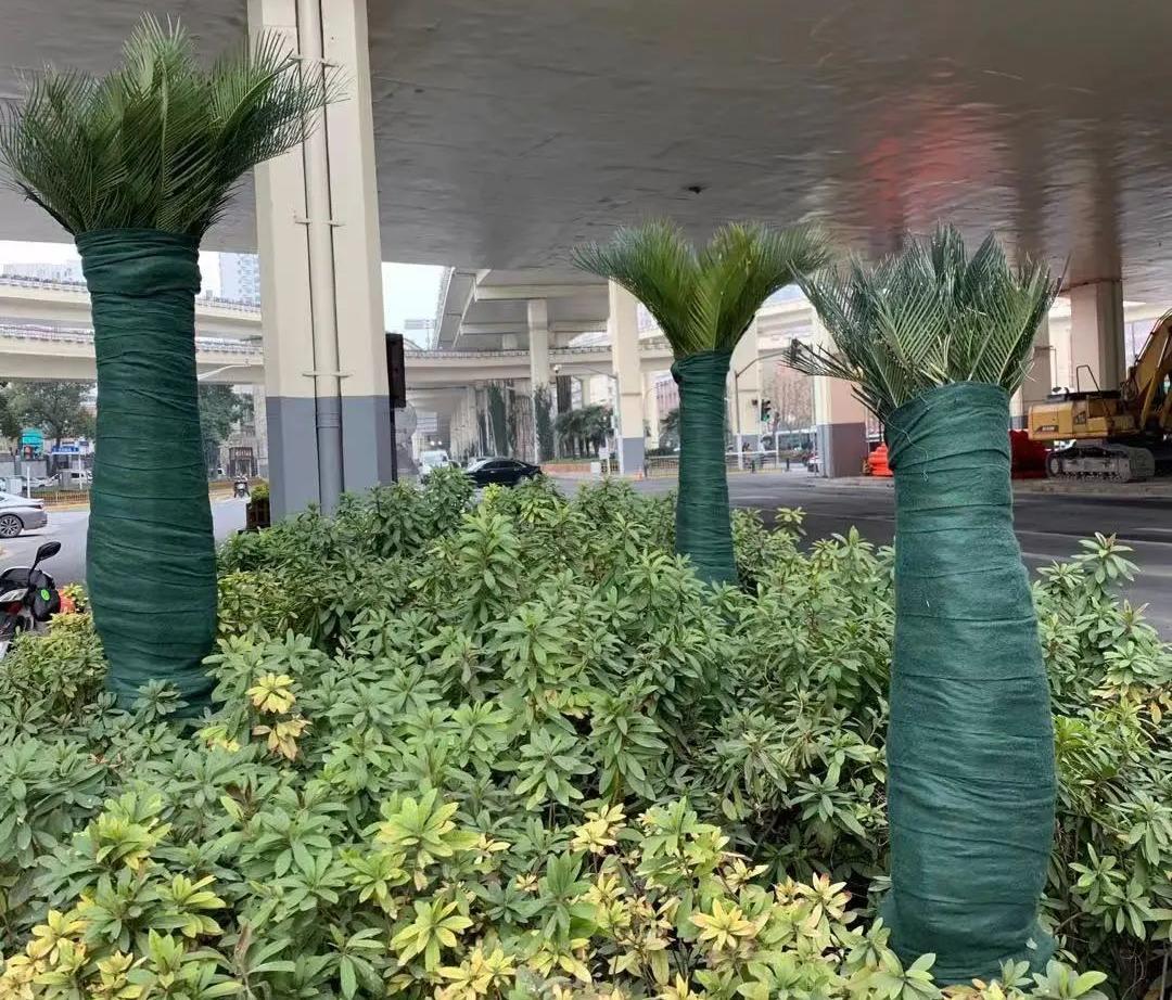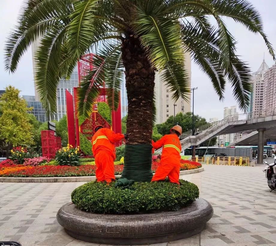 针对部分对低温耐受力较差的植物,养护人员采用无纺布进行包扎,可以防风防冻、减少水分流失,保护树木安全过冬。
