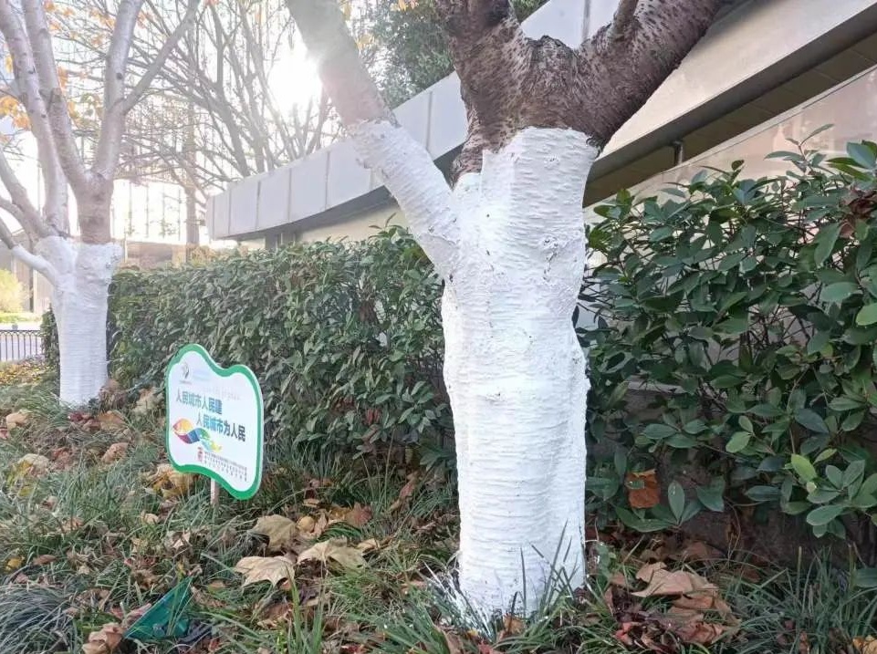 树干涂白可以反射部分阳光,减少树木吸收热辐射,从而减少树干基部昼夜温差,避免冻害和冻融交替造成的日灼伤害。同时可以消灭部分在树皮裂缝中越冬的病菌和虫卵,减少越冬病虫源。