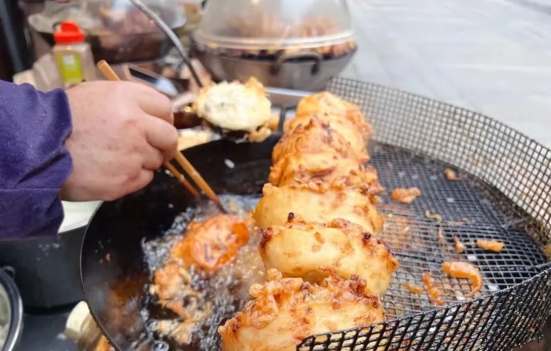 来古镇乘一乘乌篷船,顺着河道观赏风景别有一番韵味。沿河还有很多小店家,汤圆、粽子、油墩子……各式小吃都是阿姨们现场制作,热气腾腾非常具有年味。