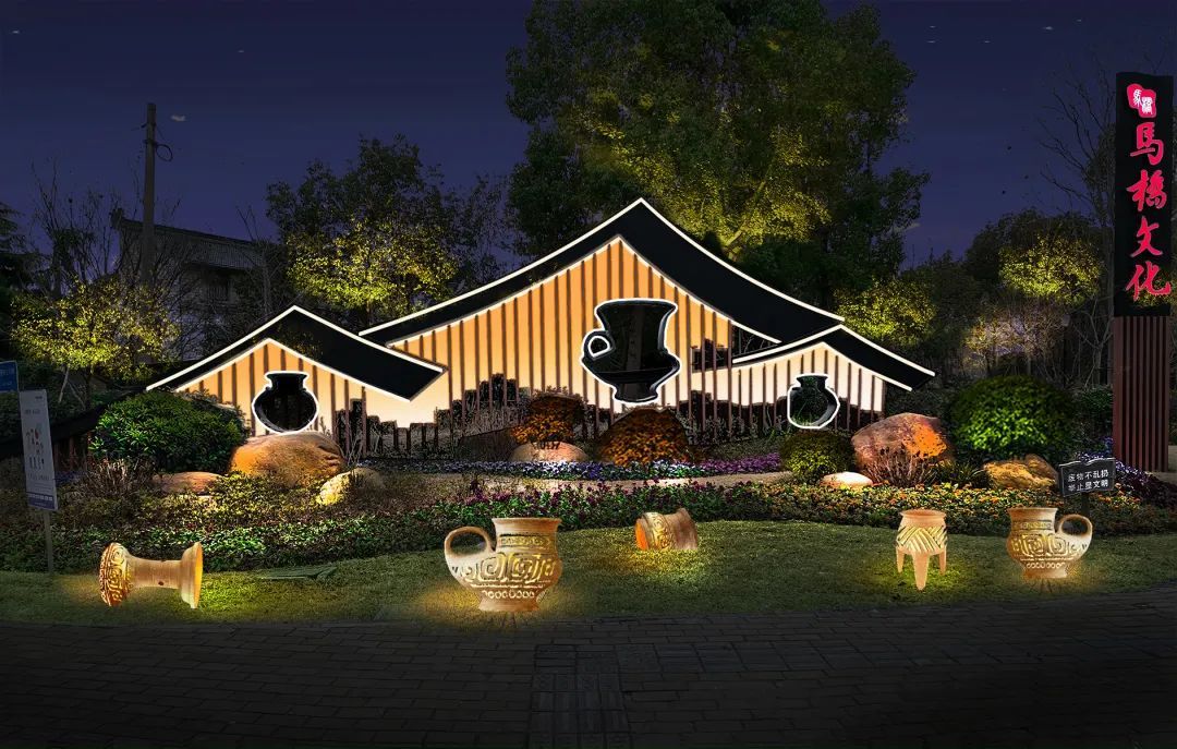 草坪上新添了数组从马桥古文化遗址中出土的陶罐的仿真装饰灯具,部分镂空并内透灯光。