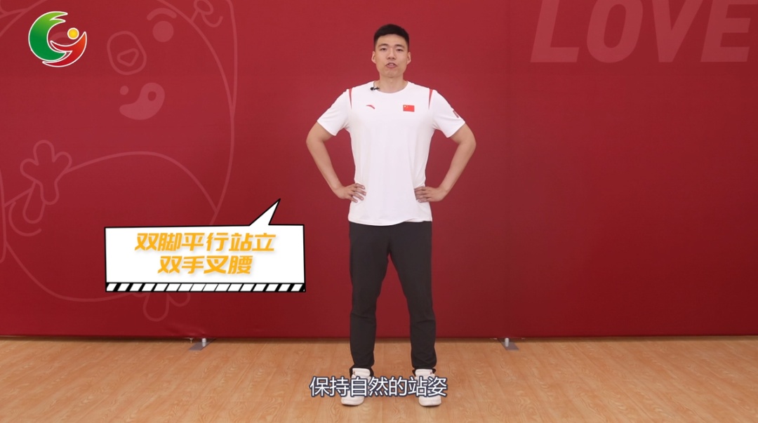 1、双脚平行站立,双手叉腰