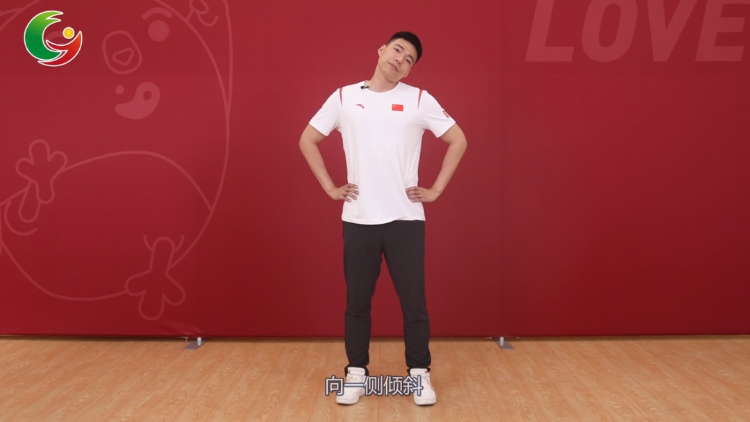 保持自然站姿,向前点头时感受颈部后侧的拉伸,向后点头时,关注颈部前侧的拉伸,左右两侧点头时放松肩膀。