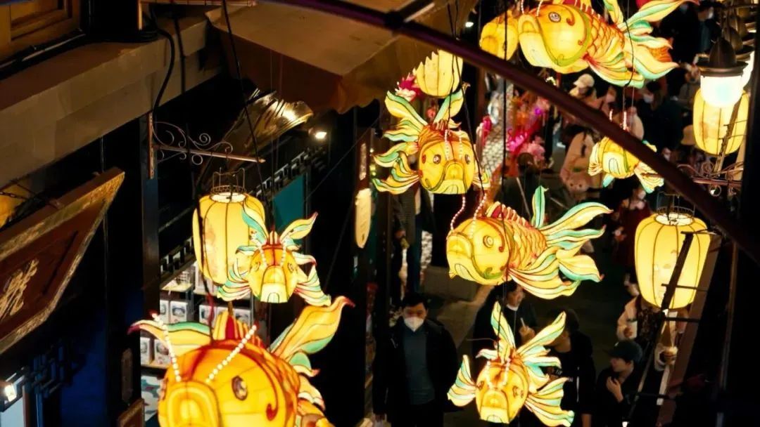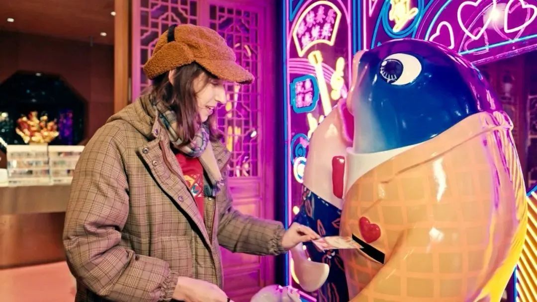 漫步豫园老街,抬头可见悬挂着的许多鱼灯装饰。乐盖曦说,鱼也是中国新年的象征,因为“鱼”的中文发音像“余”,所以人们会在春节里挂上一些鱼的形象和图案。走上二楼,可以看到双鱼邮筒,它是以上海博物馆馆藏文物“粉彩佛供双鱼”为原型打造,双鱼共舞充满趣味。游客可以投递明信片,祈福未来。