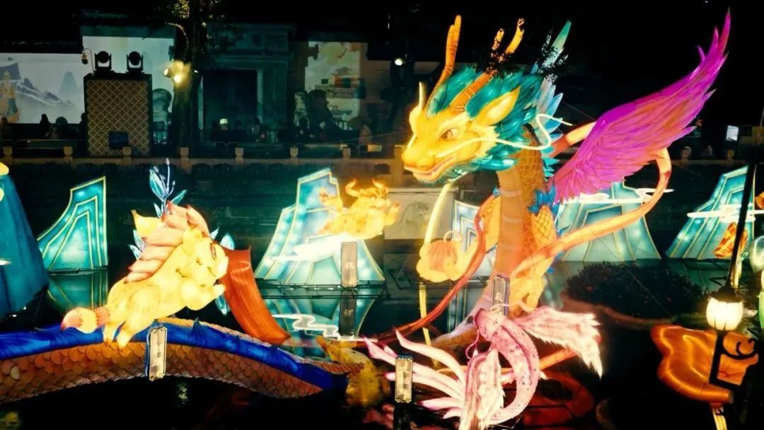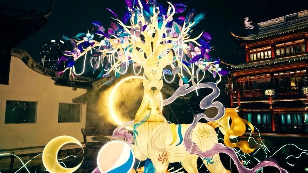 “我身后是这个灯会最令人印象深刻的灯笼之一,它叫应龙,传说它曾帮助过中国神话中的黄帝。”走在九曲桥上,乐盖曦与来自《山海经》中的耳熟能详的瑞兽、奇花异草一一邂逅。穿过湖心亭,祥瑞白鹿映入眼帘,自带仙气,“它是长寿与和平的象征。”乐盖曦说。
