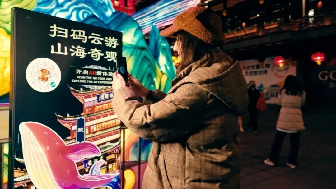 在璀璨夺目的光影间,位于C位的是敦煌造型的“玉兔东升”。扫一扫侧边展图的二维码,便可通过AR虚拟现实云游山海奇观。