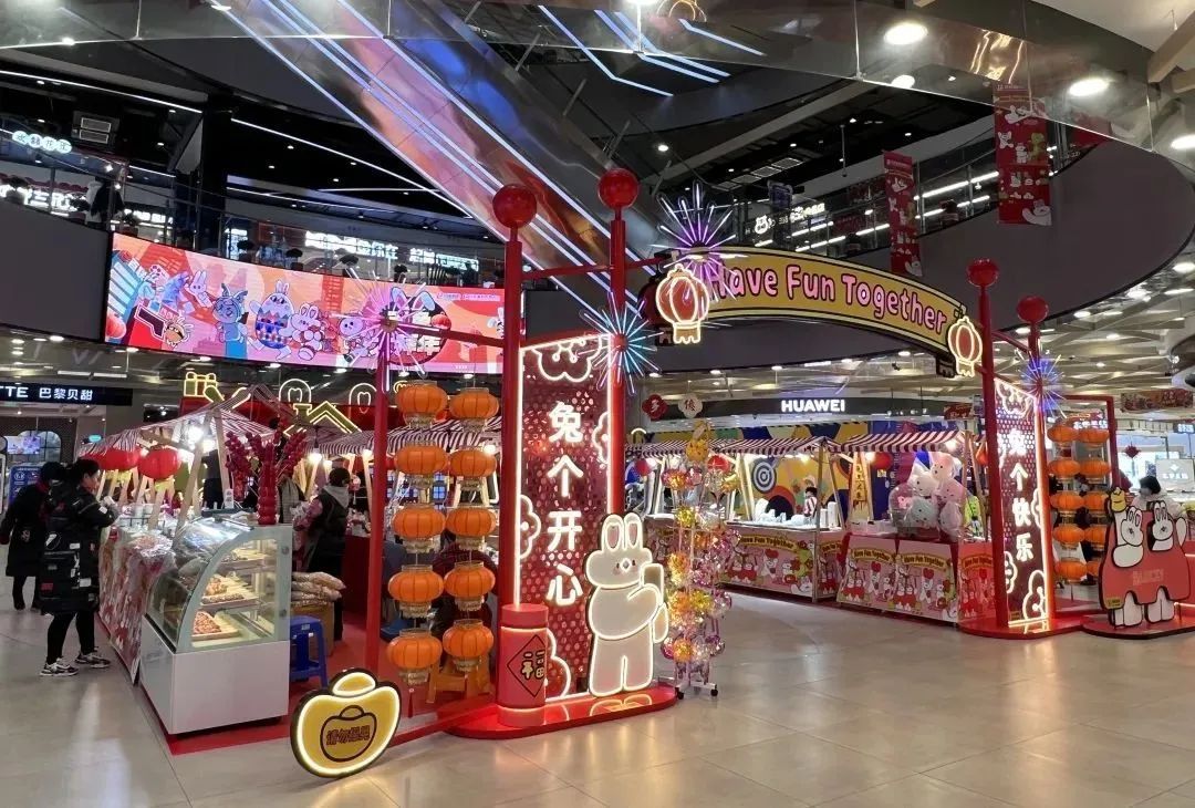 顾客们在逛街时会偶遇“邻妹妹”,也可以直奔她的大本营商场一楼中庭的“兔”个开心游园会,感受新春欢乐氛围。