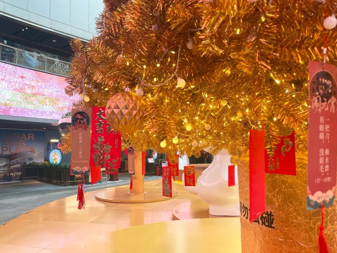商场LG2环屏区域,大型金色装置气派又精致,走近一看,装饰树上还挂着红包和灯谜,让顾客们直呼有新意。