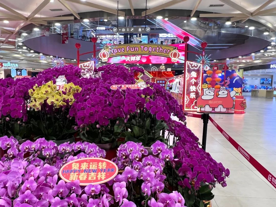 此外,在入口处布置的蝴蝶兰景观和各个角落的杜鹃花迎新花卉都表达了商场对新一年春的期盼。