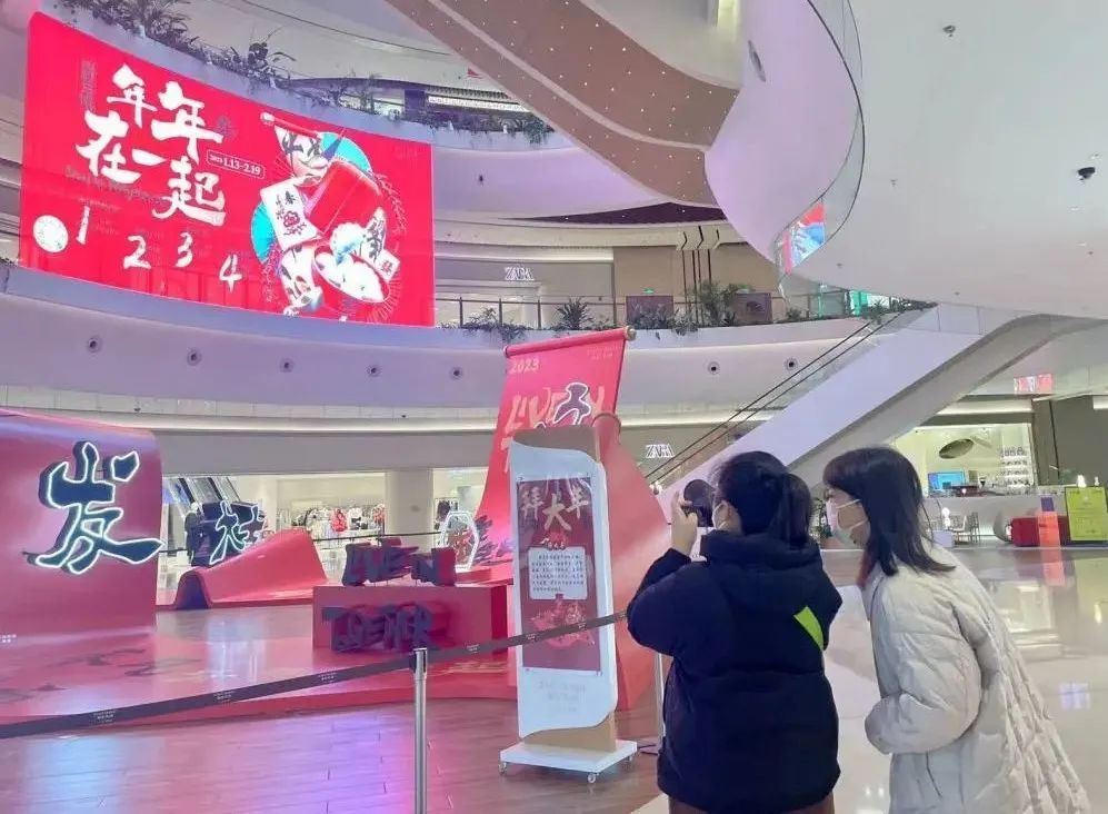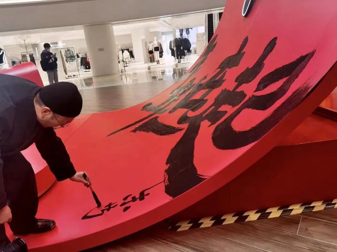 在太阳宫一楼主中庭,有一幅近一层楼高的巨型书法卷轴。“春风拂面”“笑颜开”“新气象”......表达了商场对新年的美好期盼。其中,“年年在一起”由书法家朱敬一老师亲笔挥毫。