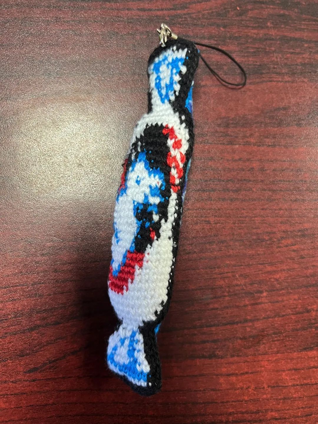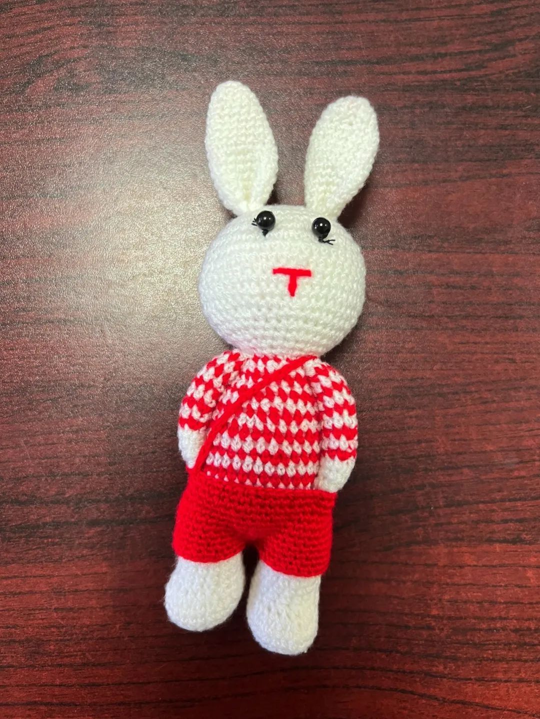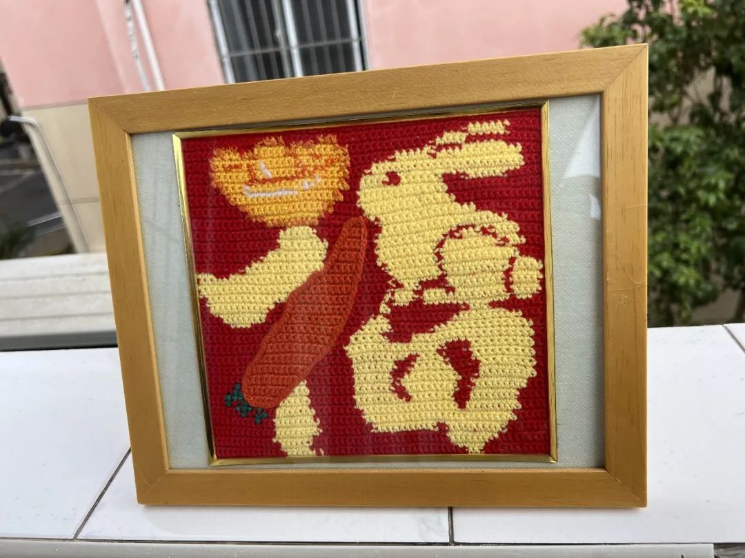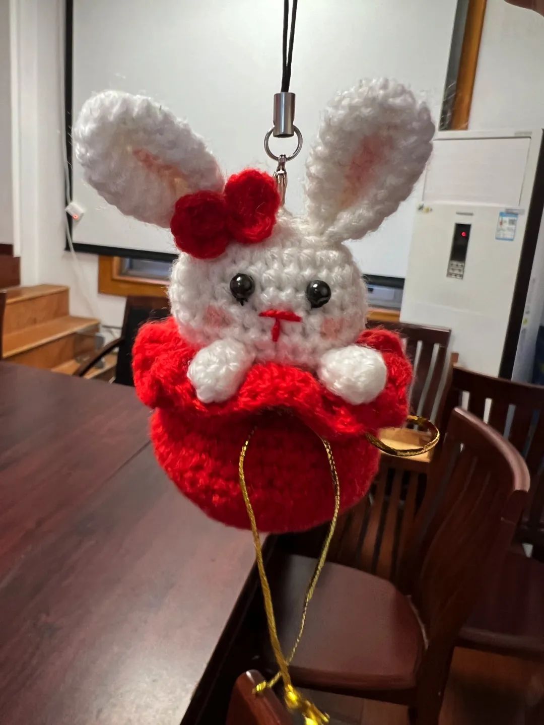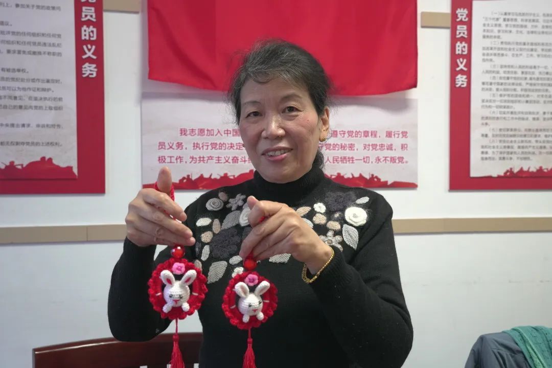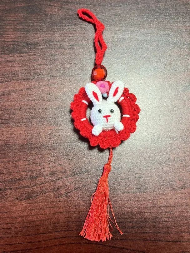 新的一年,任彩娥再次发挥创意,制作了一个“萌兔”挂件,巧妙地将兔年元素与传统挂件相结合,并通过钩针编织展现出了一个活泼可爱的“萌兔”挂件。