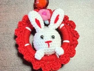 第十二步:通过钩针将装饰性小花钩编在兔子耳朵中间后就完成了“萌兔”挂件的制作。