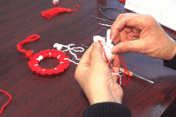 第五步:在花边的收口处钩编一条长长的线作为挂件的绳子,并将挂件的装饰红色珠子串进去。