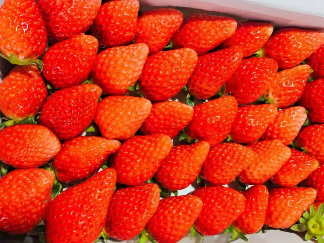 其中,“申鑫”草莓果实呈心形或短圆锥形,果面鲜红富有光泽,着色一致,果肉橙红色、肉细韧、汁液中等、甜酸适口、香味浓郁。
