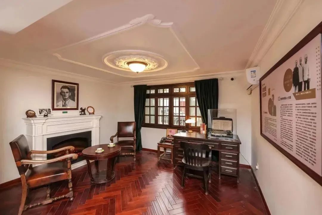 路易·艾黎故居位于愚园路1315弄4号楼底楼的一间房内,整个空间还原了路易·艾黎的会客室场景,摆放的书橱、写字桌、靠椅、茶几、椅子、台灯、衣帽架等家具也整体参照20世纪二三十年代的家具风格。