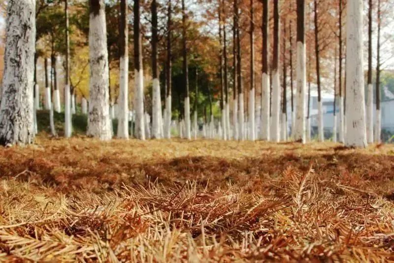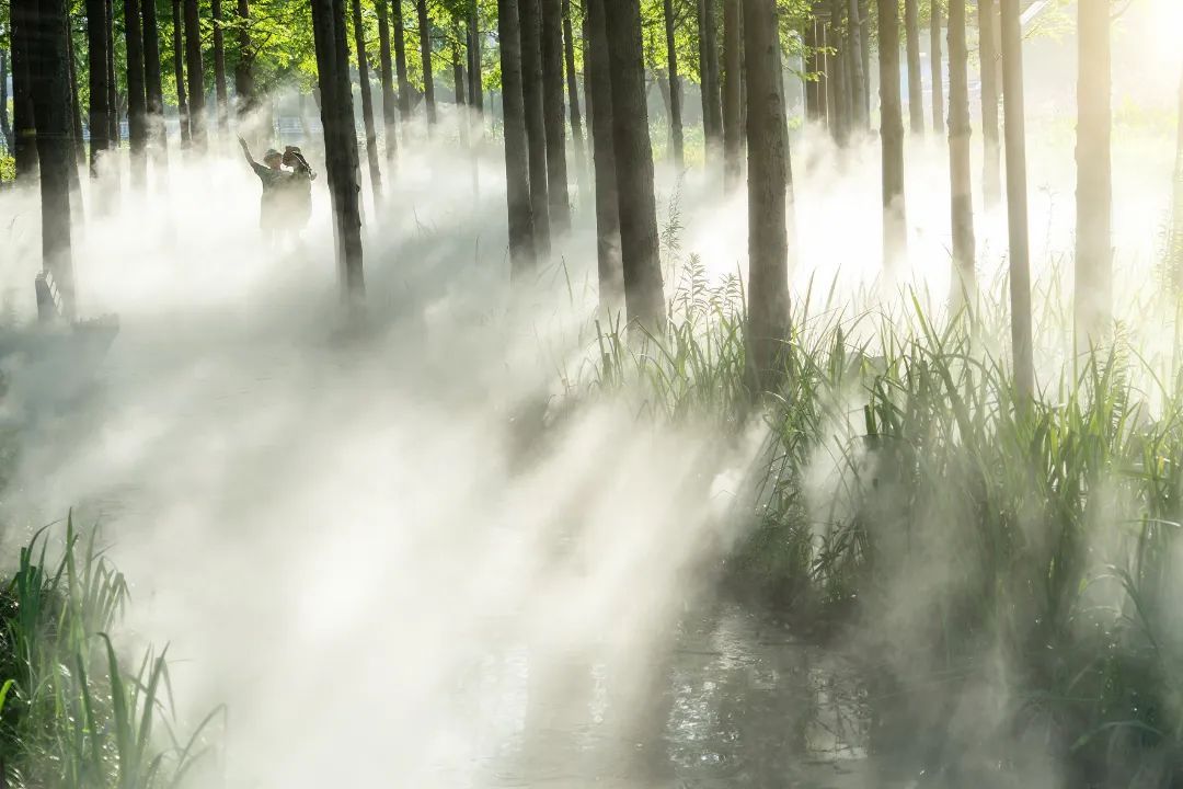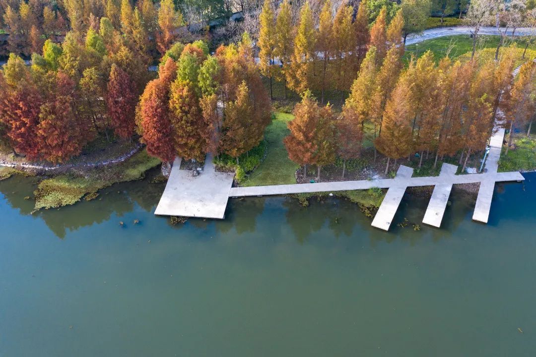 从嘉罗公路五号桥望去,练祁河两岸的杉树笔直挺拔。走入环湖步道,犹如进入一片静谧的丛林秘境,树木依次排开,景色宜人。