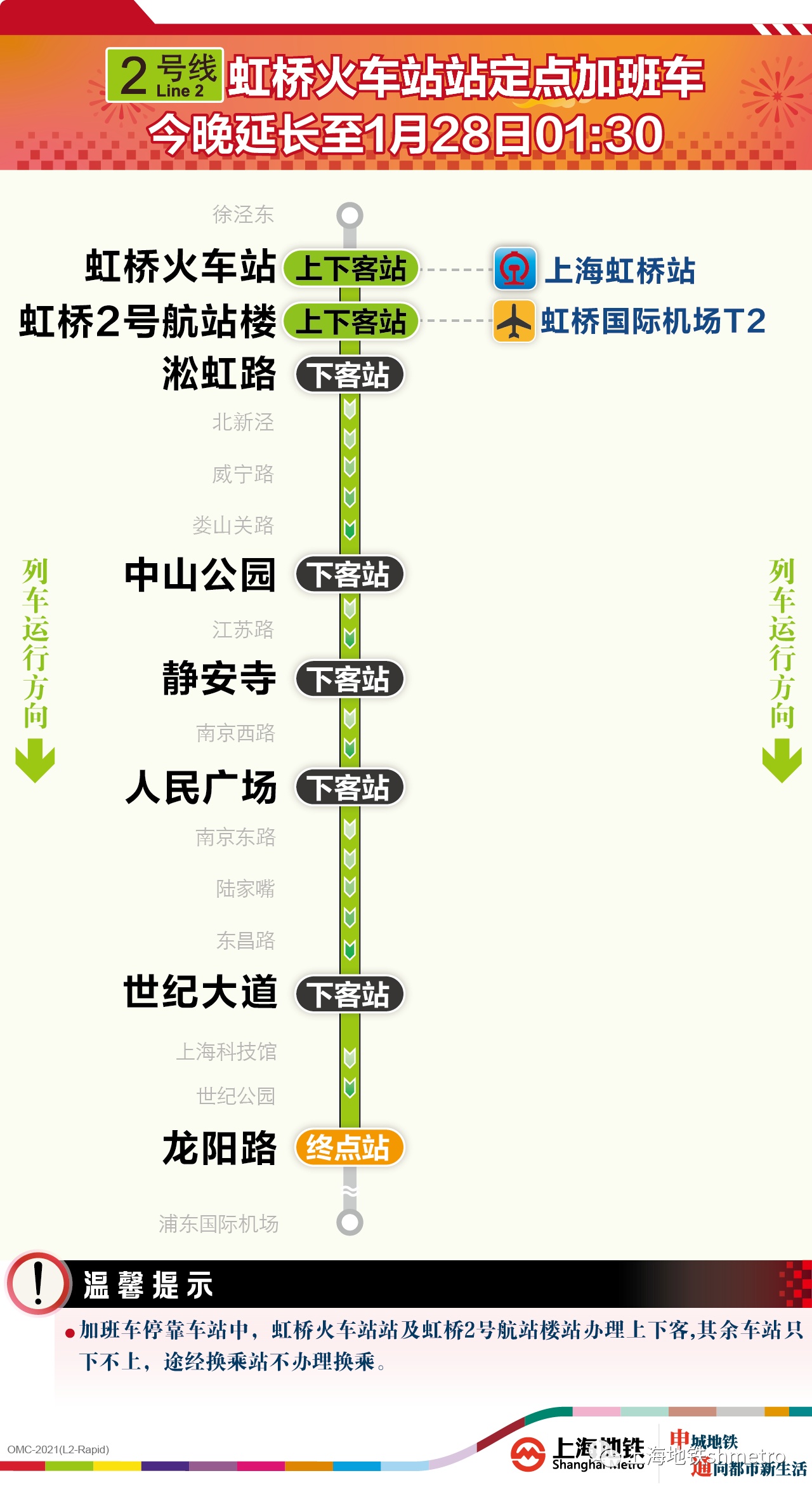 2号线虹桥火车站站往龙阳路站方向定点加班车,沿途仅停靠虹桥火车站站、虹桥2号航站楼站、淞虹路站、中山公园站、静安寺站、人民广场站、世纪大道站、龙阳路站、其余车站跳停。停靠车站中,虹桥火车站站、虹桥2号航站楼站可上下客,其余车站只下不上,途经换乘站不可换乘。