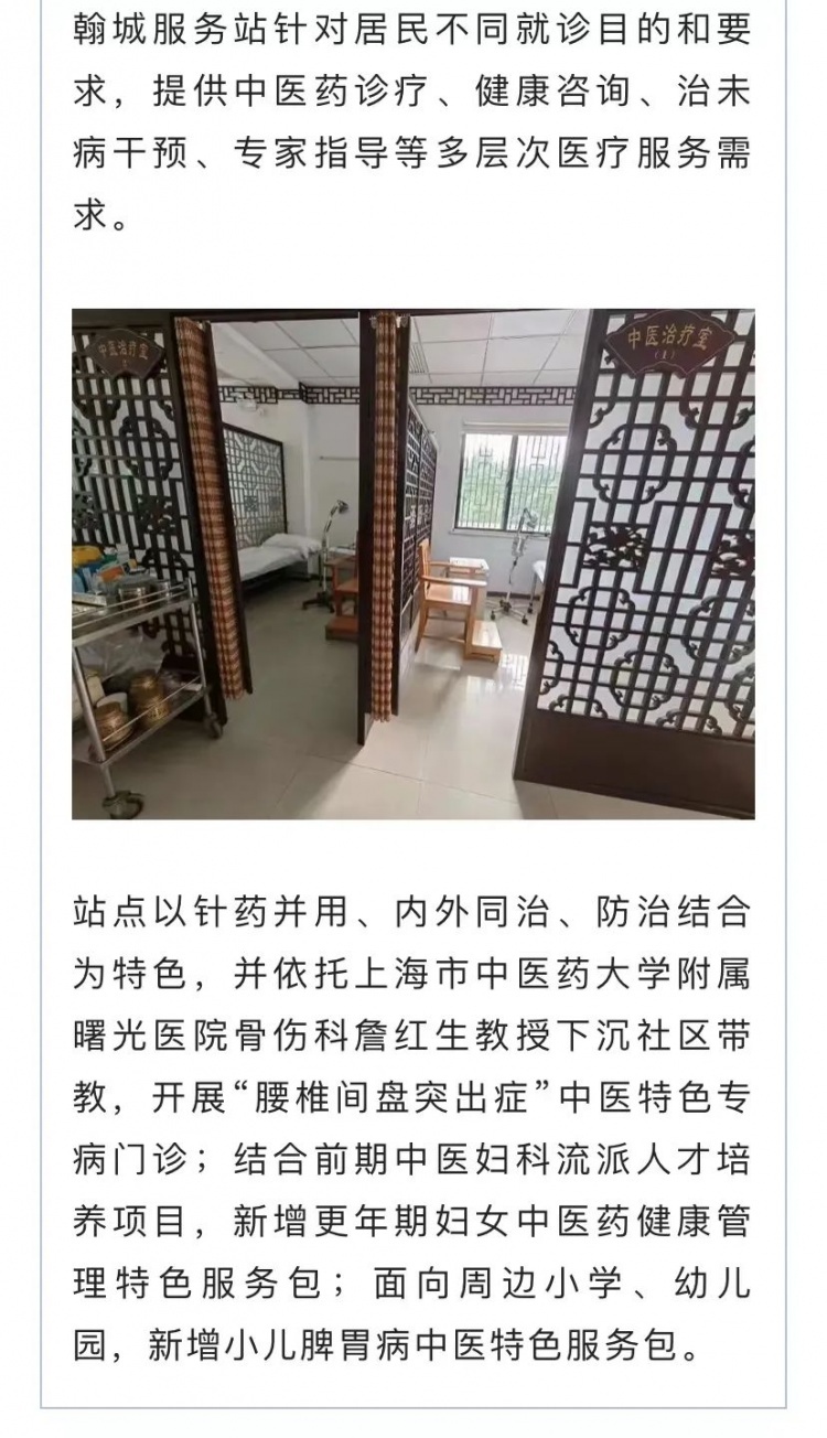服务站融中西医诊疗、健康管理、中医生活方式推广等医康养功能,满足居民更多的健康保健需求。站点以“腰椎间盘突出症专病门诊”和“尿控疾病专病门诊”为特色,落实基础中医医疗服务,提供中药饮片服务和6类26项中医诊疗项目。设立邓皖利名中医工作室,赵琛名医工作室,并邀请腰椎间盘突出专病的中医专家、浦东名中医齐昌菊教授下沉站点,开展中医带教指导和特色品牌诊疗服务。