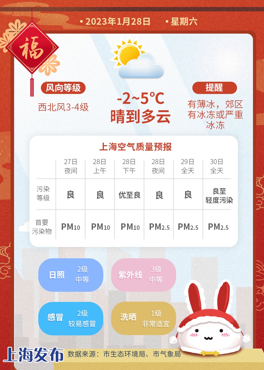 兔年的第一个工作日到来,大家在晴冷的天气中开工,今天晴到多云,市区零下2度~5度,有薄冰,郊区最低气温零下5度~零下3度,有冰冻或严重冰冻。西北风3~4级,空气相对湿度70%~20%。大家继续做好防寒保暖润燥。