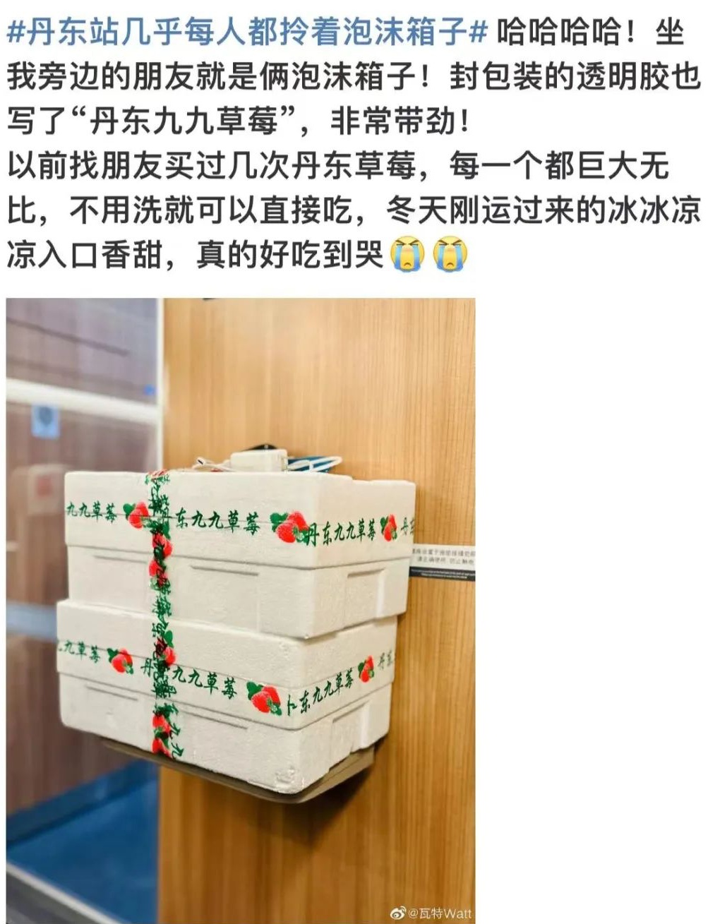 据视频拍摄者介绍,这样的场景每年都会见到。过年正值丹东草莓上市,大家都会用泡沫箱装好,带给亲人朋友。