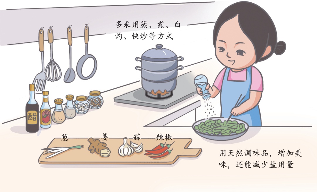 建议多尝试蒸、煮、白灼、快炒等方式,放盐的时间也改为起锅前,让盐保留在食物表面,既能保留咸味,又能避免放盐过多。