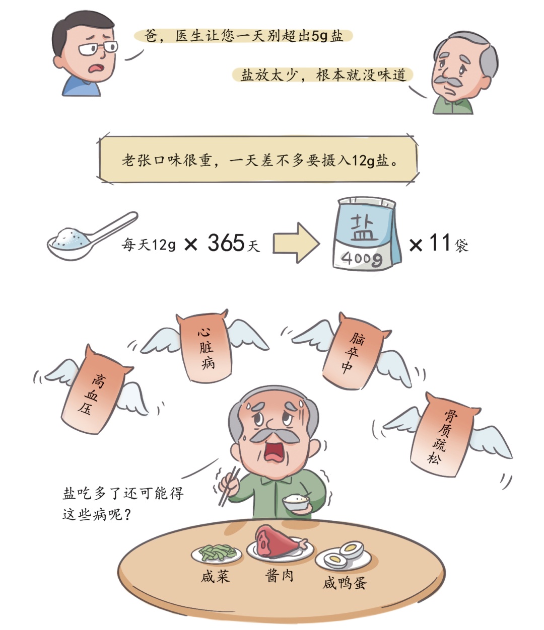 数据显示,中国人平均每人每天的食盐摄入量为12g,一年大概要吃掉4.4kg的盐,换算成400g一袋的盐来计算,一个人一年就要吃掉约11袋盐。这远远超出了《健康中国行动(2019—2030年)》中健康成人每天不超过5g盐的摄入量标准。