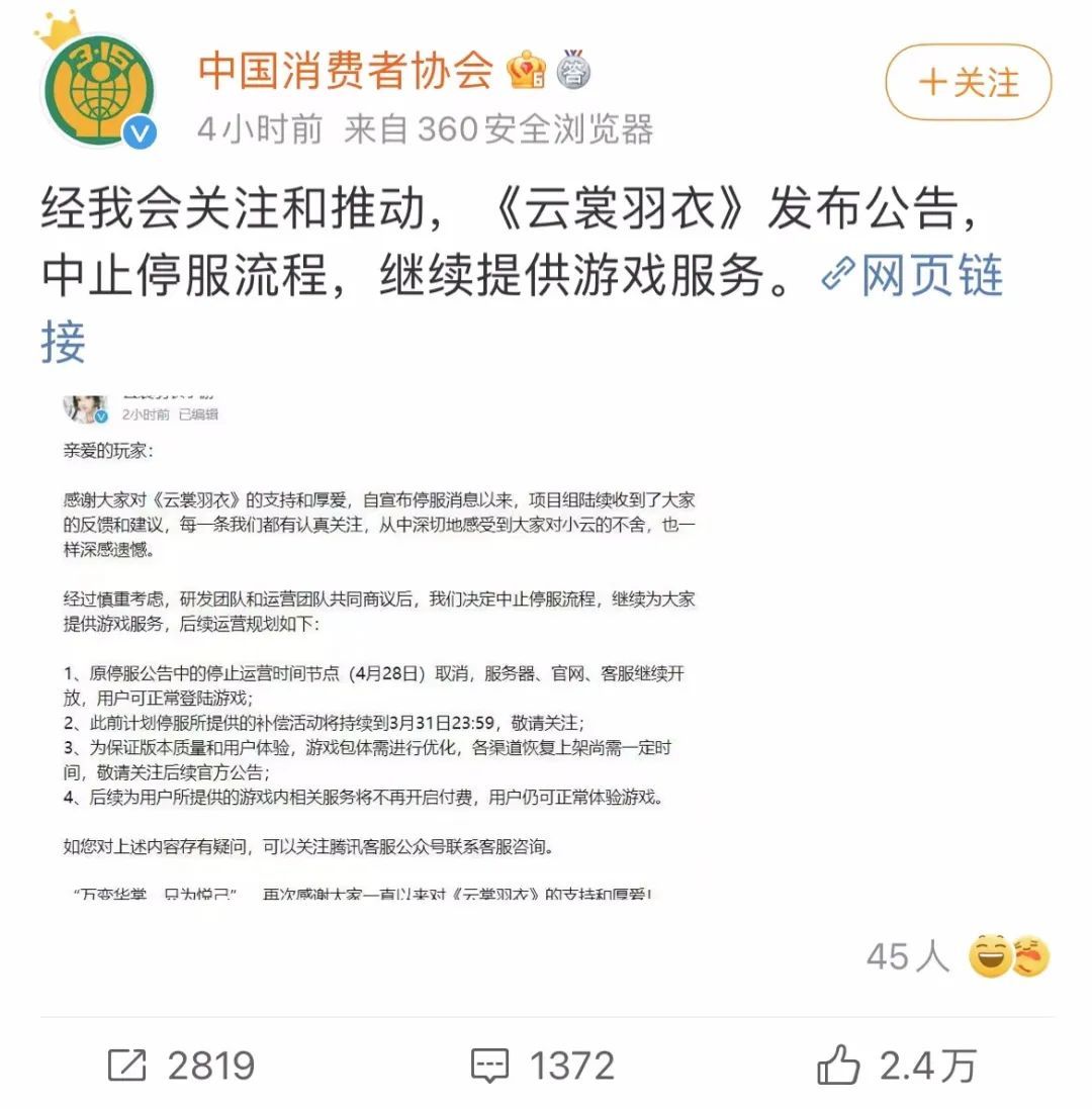 2022年2月,手游《云裳羽衣》停止运营引发消费者大量不满,中消协介入后,该游戏运营方中止了停服流程。2022年11月下旬,“网易与暴雪停止合作”事件也引发舆论对拥有庞大玩家群体的《魔兽世界》《炉石传说》等游戏可能因“停服”导致消费者权益受损隐患的关注。