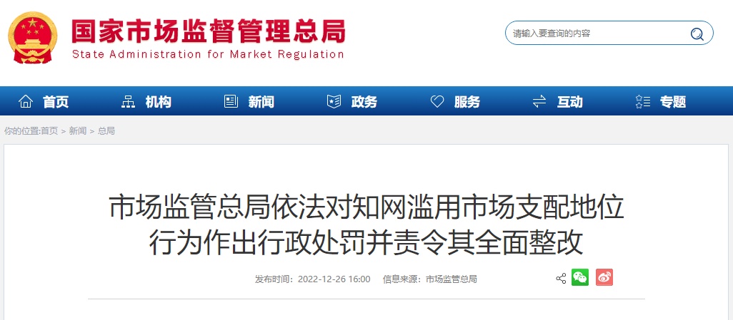 2022年12月26日,市场监管总局依法对知网滥用市场支配地位行为作出行政处罚,责令知网停止违法行为,并依法处以8760万元罚款,对此知网回应诚恳接受,并公布了15项整改措施,有关知网的垄断争议落下帷幕。