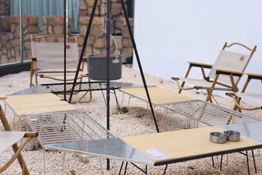 该门店占地1000平方米,室内外三层空间,延续了早安野宿的“野营”基因。开放式空间内布置了户外帐篷、野餐桌、烧烤架和各种炊具等“装备”,就连地面都铺着碎木块还原露营场景,为主题餐厅氛围的营造增添了仪式感。