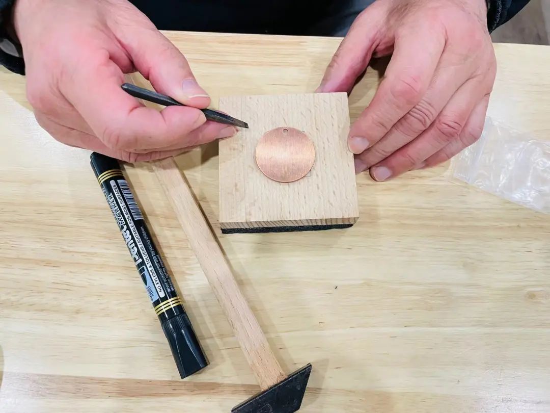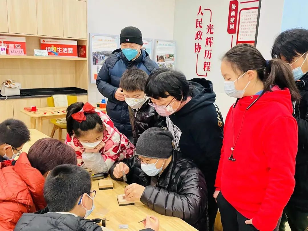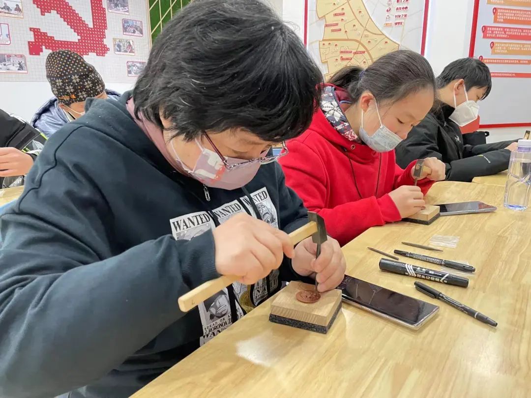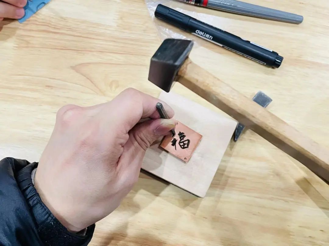 现场,周老师从玉石器、骨角器等加工技术演化历史讲起,介绍了始于商代的花丝工艺、盛行于明景泰的景泰蓝工艺,同时详细讲解了老凤祥国家级金银细工的历史传承、工艺手法和錾刻的技巧要点,让参与者在纯铜挂件上錾刻新年福字,在实践中初步掌握金银细工錾刻技巧,体会传统工艺的奥妙与趣味,产生对非遗文化的热爱与保护意识。老师边讲解边教授应当如何用小锤敲击錾具,使单一的金属表面产生多层次的立体效果。家长帮着孩子们一起完成属于自己的金银细工作品。那一个闪闪发光的福字,洋溢着新年的新气象。