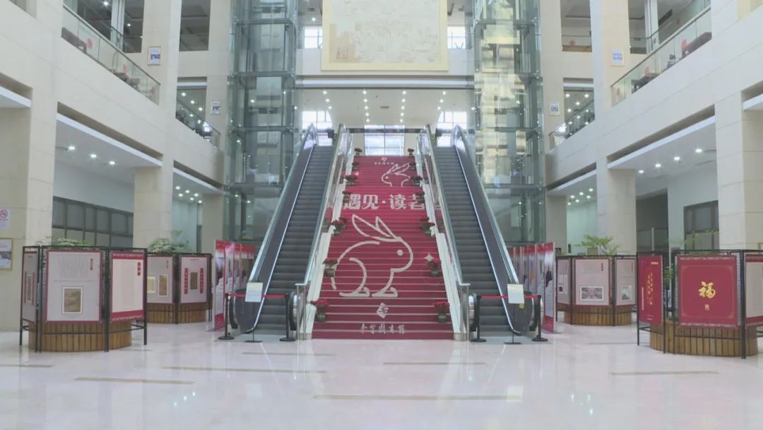 刚进大厅就能看到两只萌兔在通往二楼的长阶梯上欢迎着读者的到来。此次典籍文化展位于一楼大厅,在两侧展出了40幅与“兔”有关的经典展板,通过丰富的文字与古籍照片,集成故宫博物院、国家图书馆等多方藏品影像,以时间为轴,细数从小年至上元期间,典籍记录下的新年“兔”文化,展现书籍里的新年,让读者们都成了一名名“兔”专家。