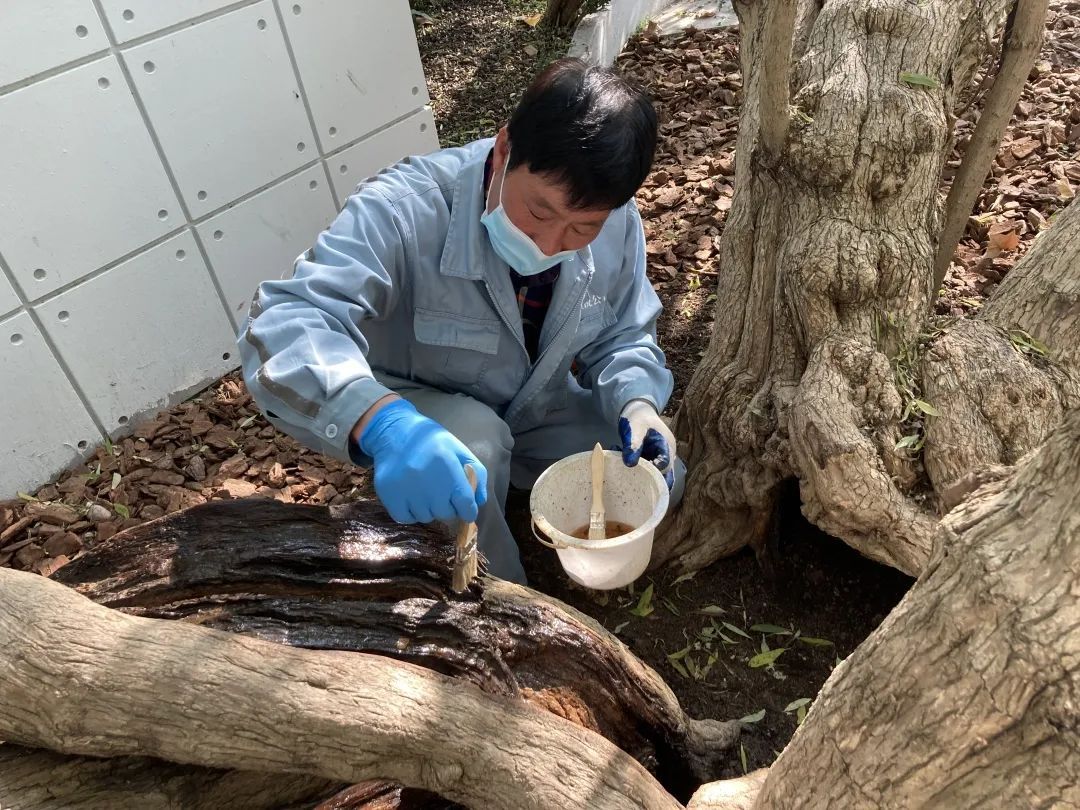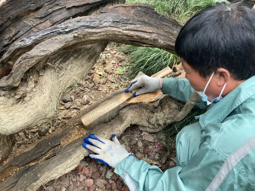 复兴公园古树群养护的老工匠,从敲除水泥、清腐、除菌......到最后分5次全创面涂刷桐油防腐,耐心沉着、专注娴熟地一遍一遍对大面积复杂创面涂刷。