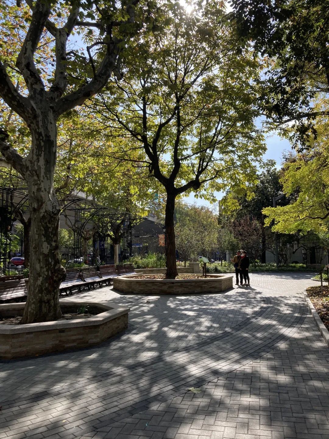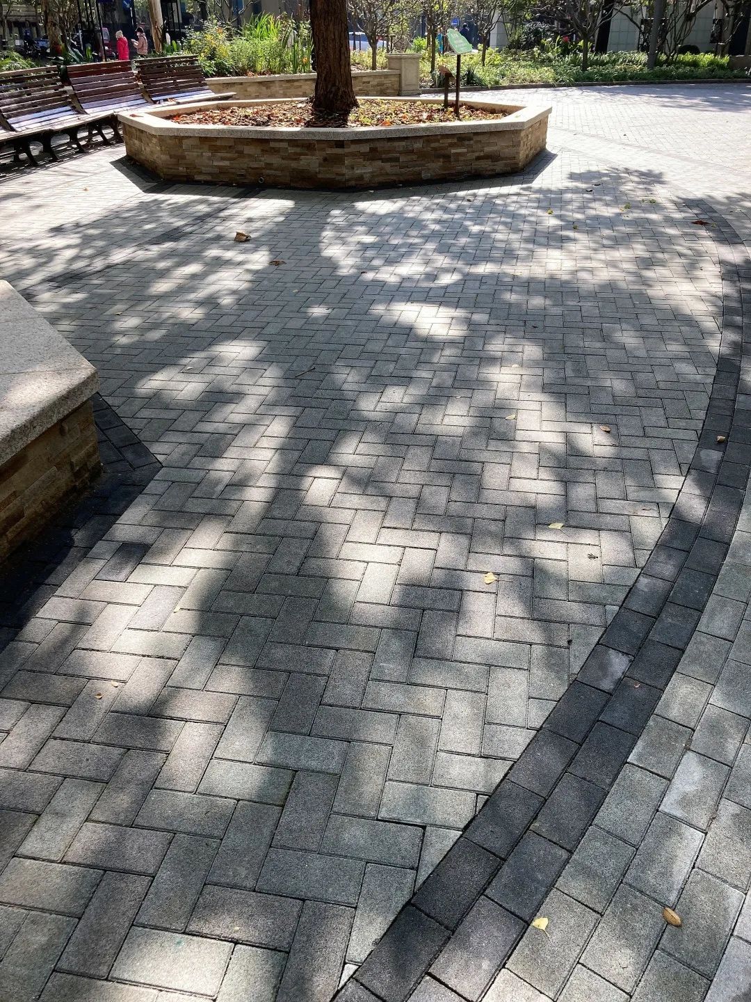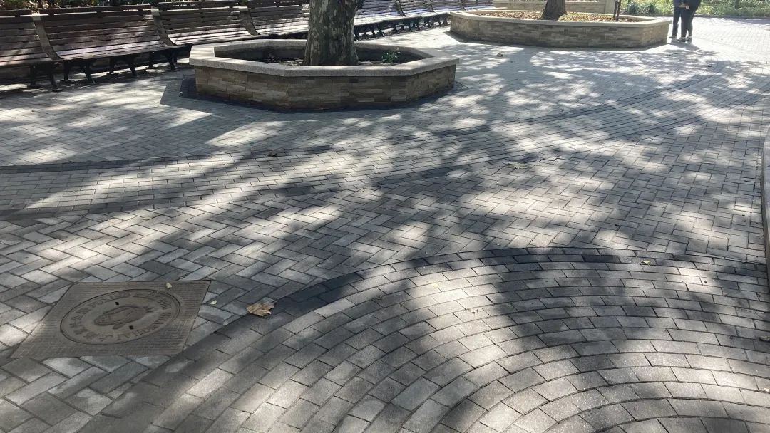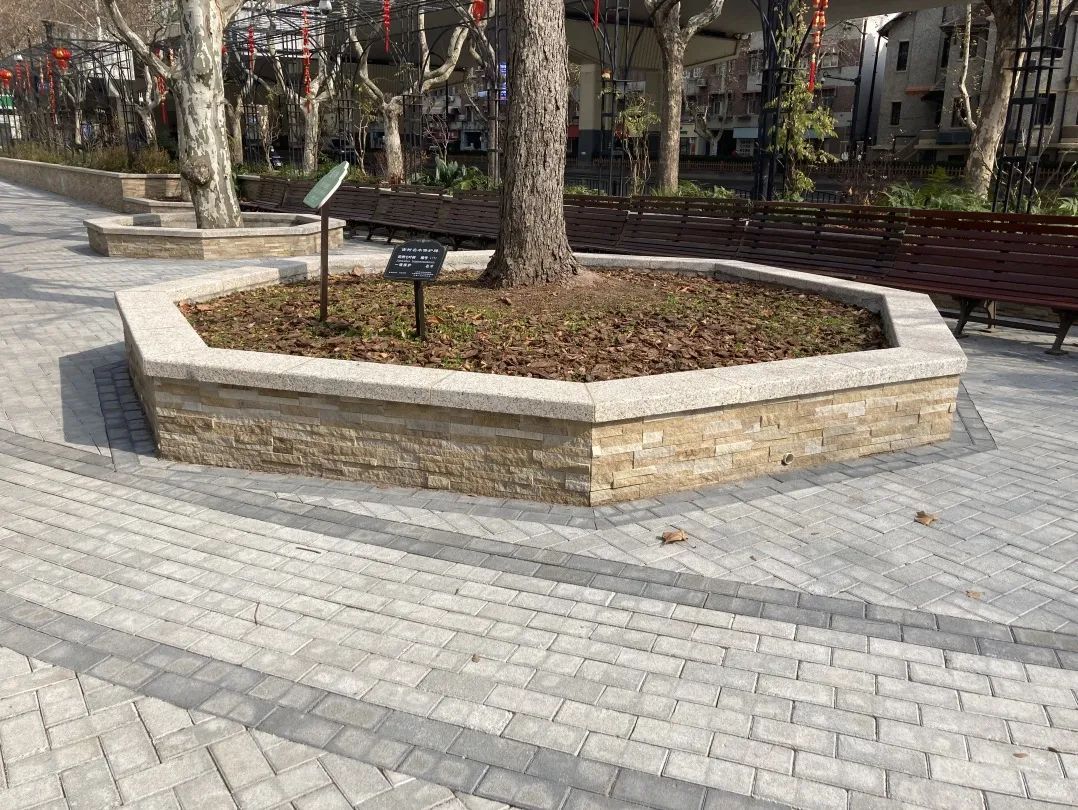 1151号欧洲七叶树不仅是复兴公园唯一的名木,也是复兴公园古树群的明星古树,无论花、果、叶都具有独特的观赏价值,深受市民的喜爱。此次改造,我们去除了围栏,为树穴更换了贴面,增加了盖板,形成可供游人休憩的座椅,拉近了人与树的距离。使用透水砖,采取素铺工艺,对古树周边的地坪重新铺装,朵朵涟漪的纹饰更添艺术美感。