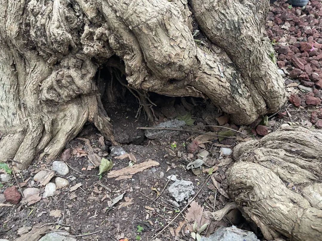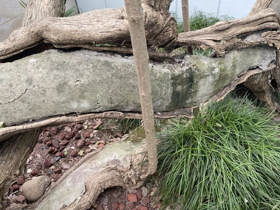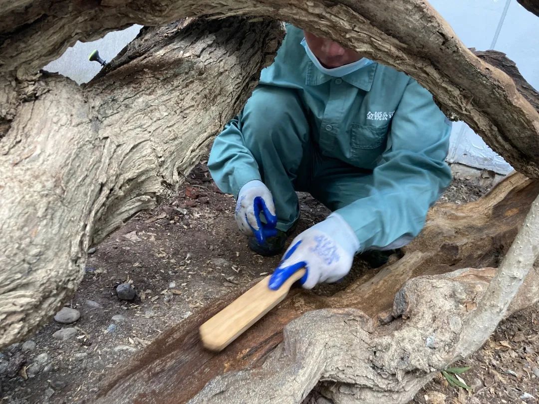 该古树保护中遇到最大的难点是清腐防腐,该古树为丛生,多个分枝仅余部分树皮,根基部空洞,十多年前灌注的水泥已老化破损,不再封闭。我们的方案是敲除水泥,采取开放式保护,但面临创面巨大,且千回百转不统一平整的困局,这对清腐防腐工作非常不利,无法借助机械,需要全程手工处理,耗时费力。