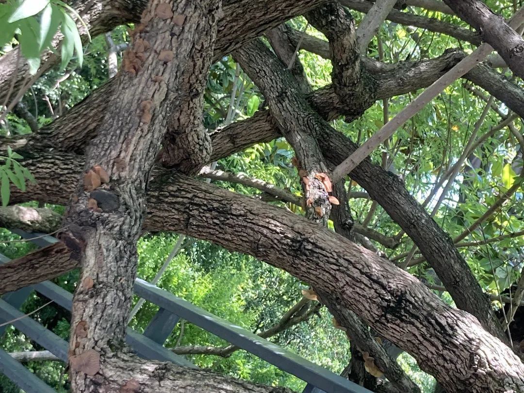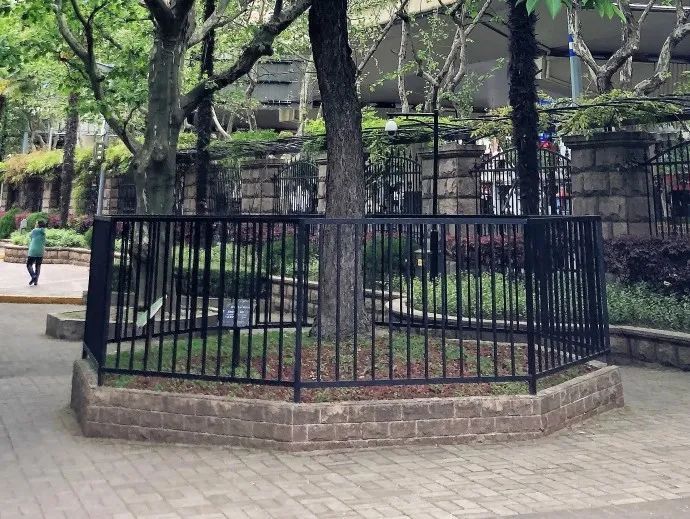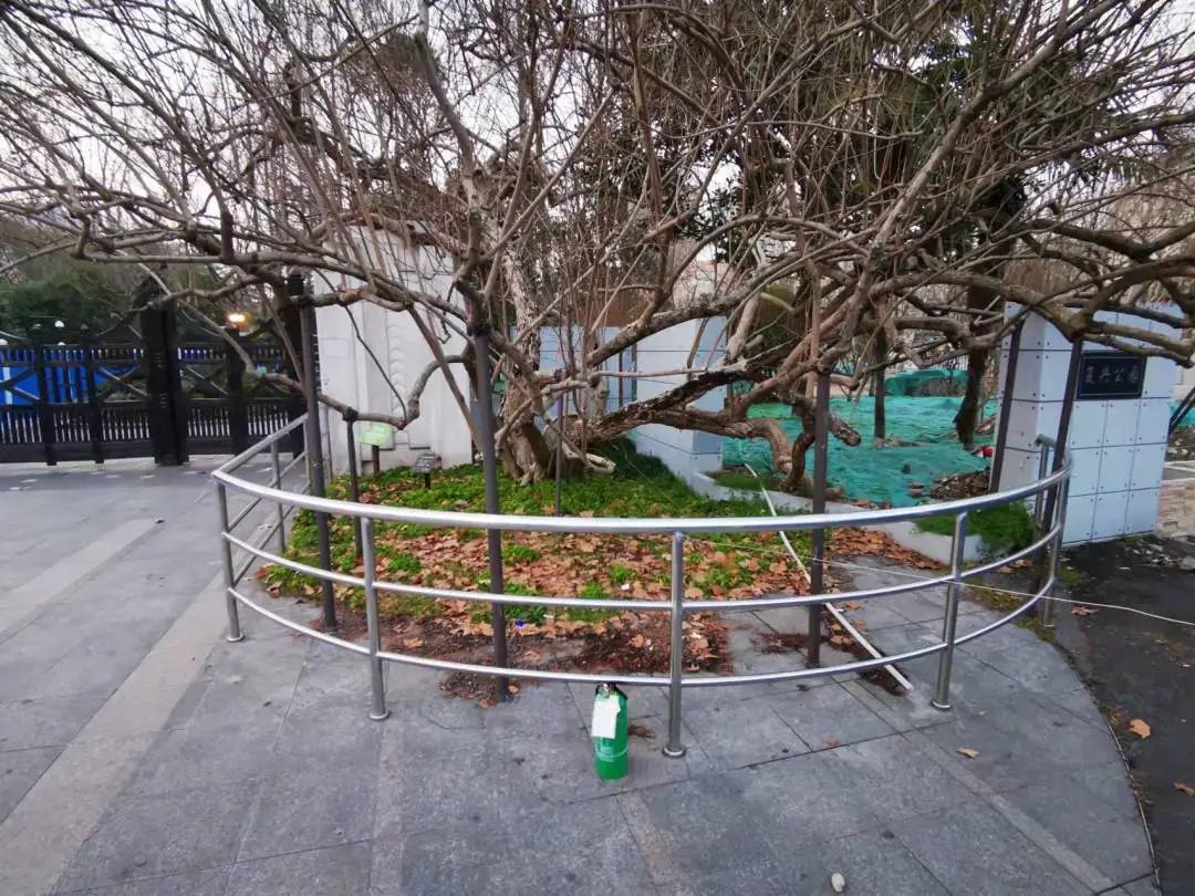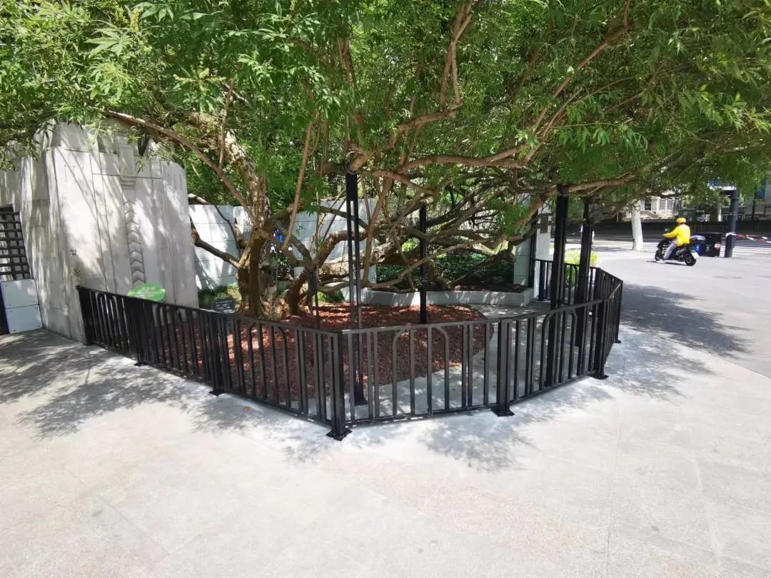 本次改造对该古树进行清腐防腐,疏枝修剪,支撑及围栏更新,土壤改良,排水疏通等复壮保护措施。将原有不锈钢围栏和支撑更换为更符合周边景观风格的黑色方铁支撑及围栏。