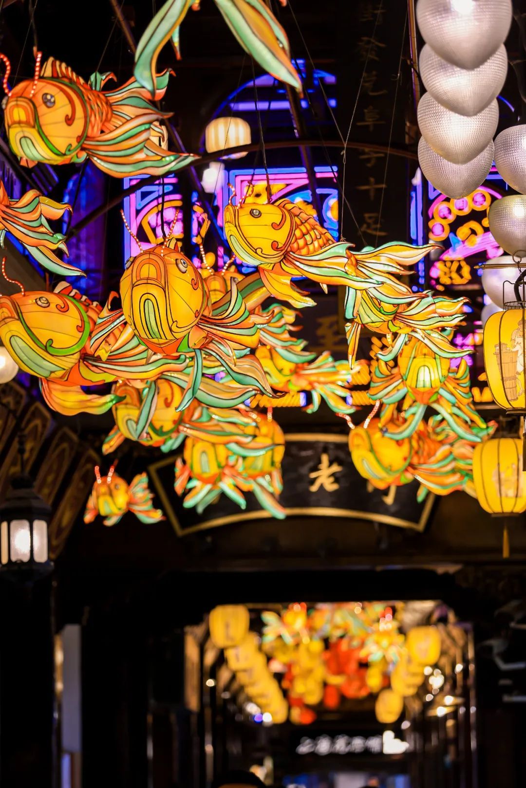 华宝楼前,玉兔戏鲲。九曲桥畔,瑞兽闹春。豫园老街,锦鲤游泳。无论是玉兔东升,还是五喜乐队……超多灯组都值得逐一打卡拍照。