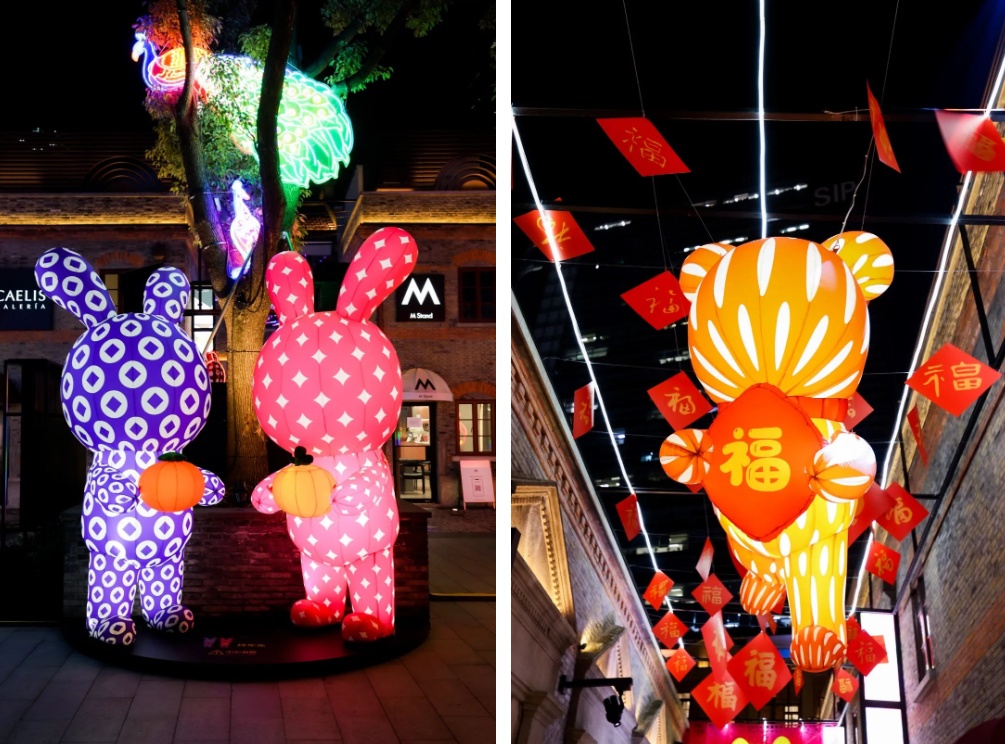 在千年古镇枫泾,一年一度的古镇灯彩展如约而至。从南镇进入旅游景区,“兔年吉祥”首先映入眼帘,老品牌文化街区“盛装”迎新春,处处张灯结彩。在三桥广场,大型卡通兔子灯彩成为了众多游客打卡的首选地。当夜幕降临,华灯初上时,各色灯笼格外引人注目,把“年味儿”的喜庆浓度加到满格。