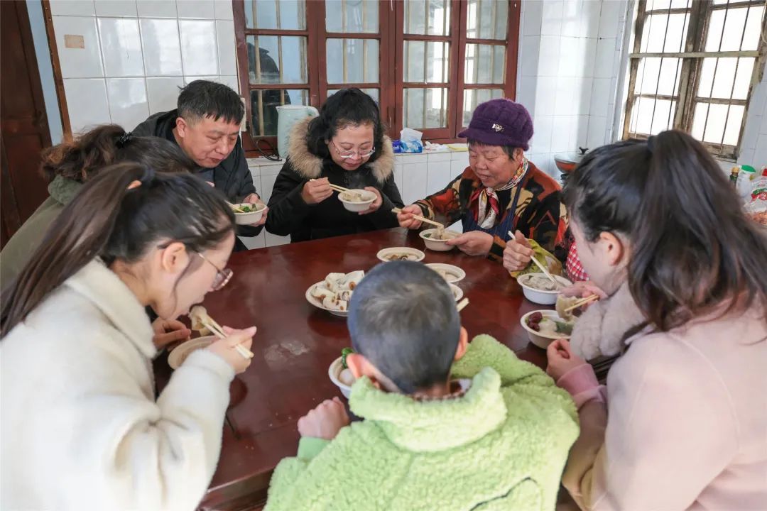 水烧开,张秀娟将馄饨、汤圆、红枣、桂圆、面条等食材逐一下锅,不一会儿,一锅寓意红红火火、团团圆圆的贺年羹就煮好了,大家围坐一圈开始品尝美味。第一次吃贺年羹,给南通姑娘小徐留下了深刻的印象:“味道很好,很喜欢大家在一起制作贺年羹的过程,让我感受到了家的味道,年的味道。”