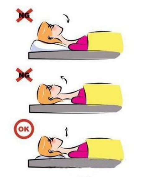 睡觉时头颈放于合适的位置,一般来说,头颈保持自然仰伸位最理想,避免枕头过高或过低。