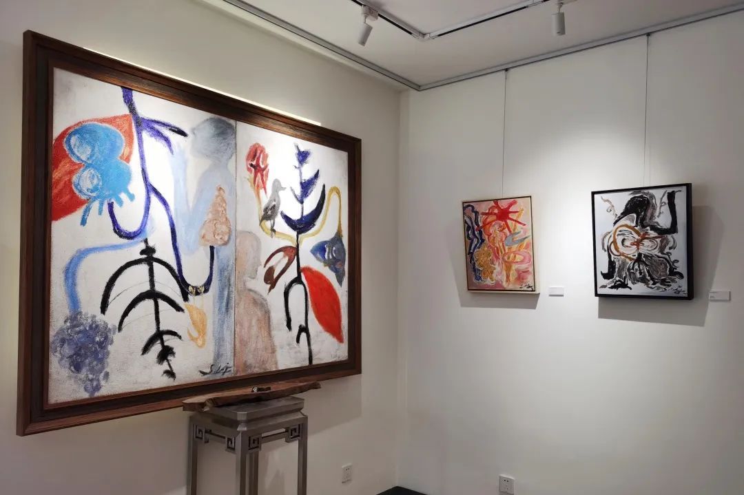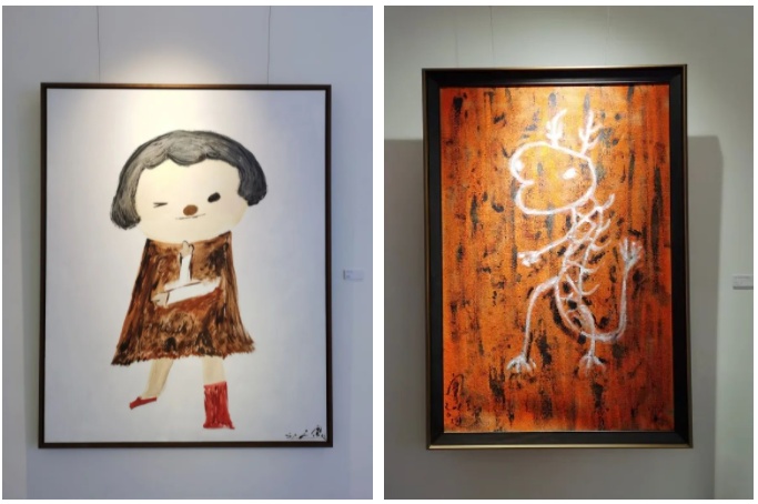 现场画作中不乏符号、象征化的图形,这是“实力姬”作品的代表元素之一,也帮助其构筑起对世界的理解。据介绍,他常常想象自己是穴居的原始人,试图用零散的图形元素、如岩间壁画般的作品,告诉世人是生命本身照亮了整个“洞穴”。