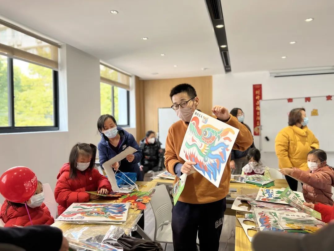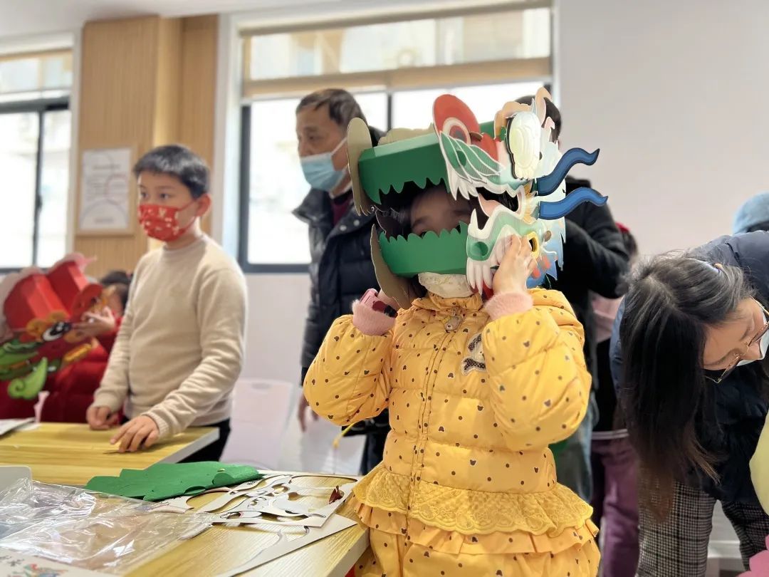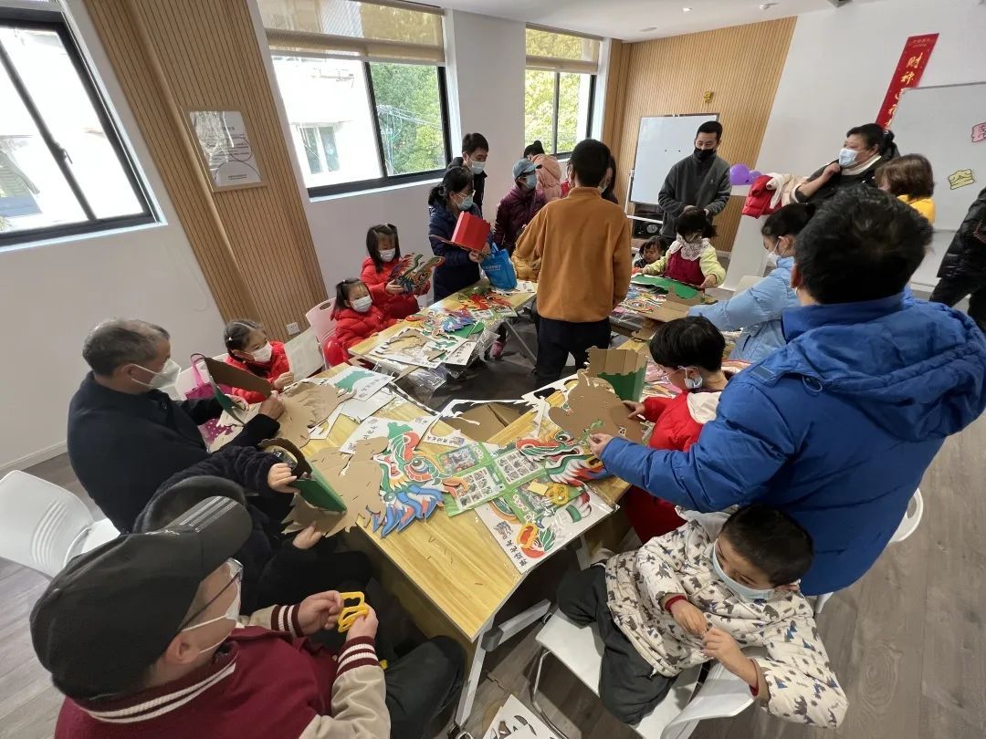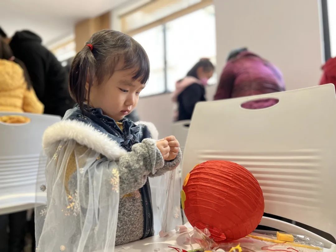 当天下午,在抚顺路社区睦邻中心的活动室里,几个手工摊位吸引亲子家庭光临。在灯笼组,孩子们小心翼翼地剪下一朵朵小红花、一只只小白兔,按照自己的设计图,粘贴在灯笼上。一旁的舞龙组,则引导大家将卡纸拆下,经过折叠、安装等步骤后,做成一只舞龙头套。色彩鲜亮的作品,让孩子们爱不释手。