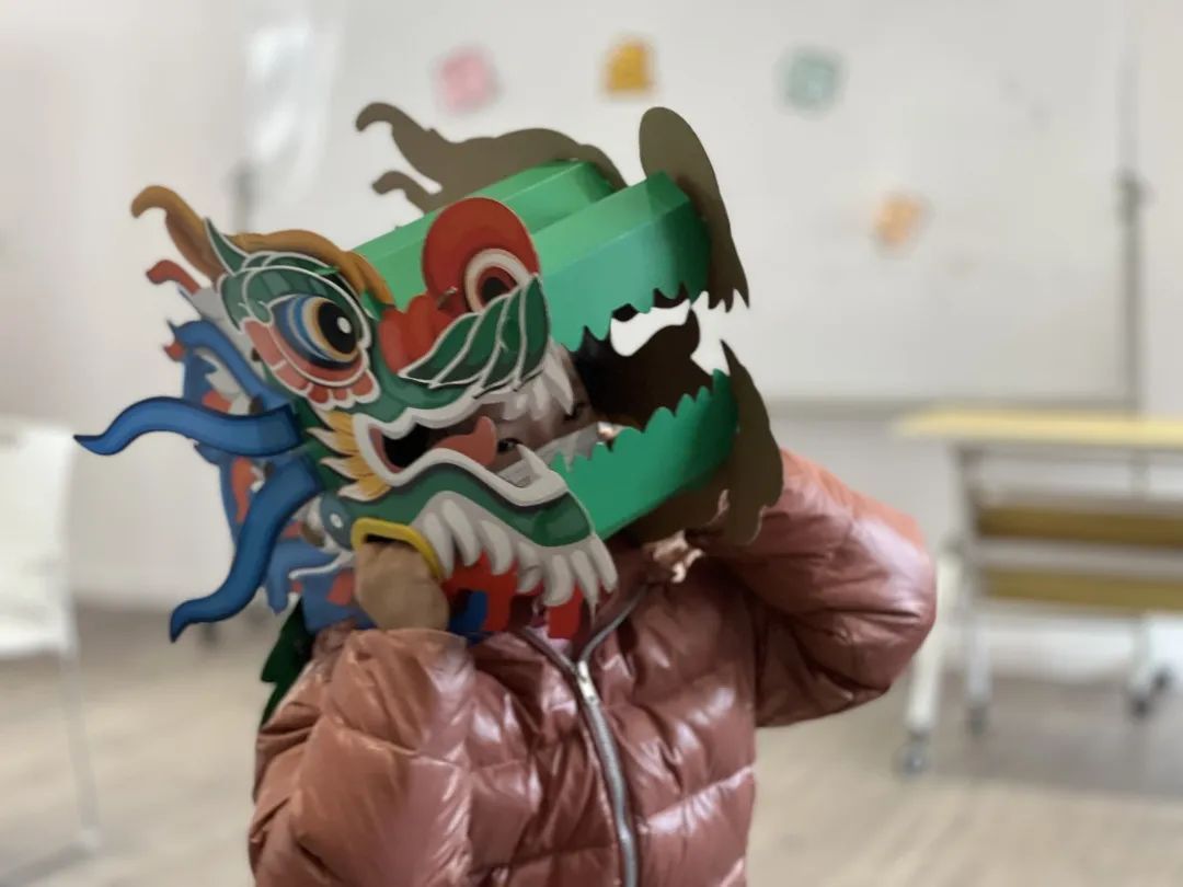小朋友宋佳蕙在妈妈的陪同下,做出了一只漂亮的蓝色舞龙头套。“我对自己的成品很满意,它长得很漂亮,背鳍也很帅气。戴上它在屋子里转一圈,感觉很酷!”