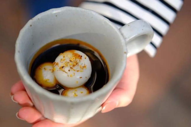 不仅在馅料上有创新,乔家栅旗下的乔咖啡还新推出了“美式汤圆”。简单说就是将美式咖啡和汤圆融合在一起,软糯香甜的芝麻汤圆加上刚刚萃取出来的浓缩咖啡,再撒上桂花碎,香气相互叠加又提升。黑芝麻内馅的甜糯与美式的苦味非常互补,咖啡爱好者可以试试这种新奇的搭配。