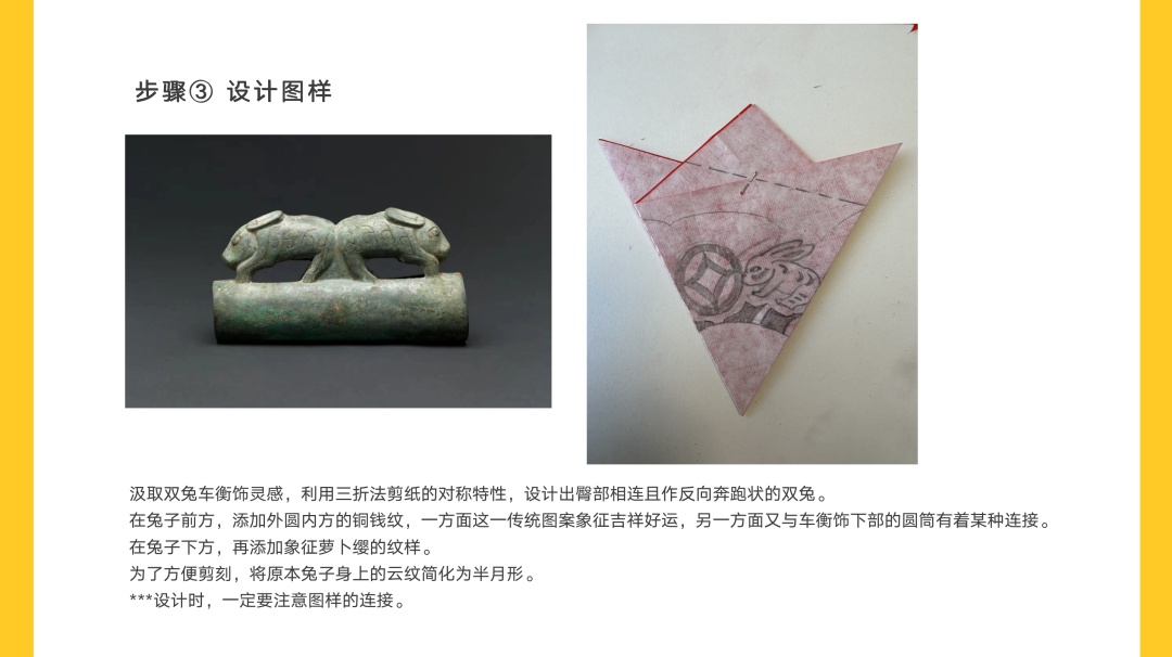 汲取双兔车衡饰灵感,利用三折法剪纸的对称特性,设计出臀部相连且作反向奔跑状的双兔。