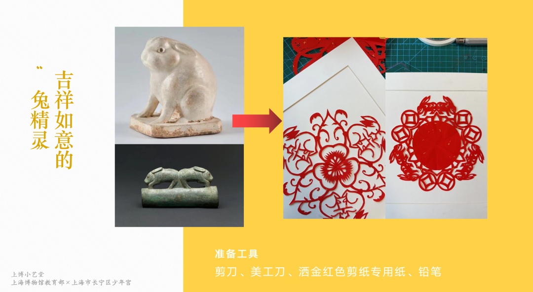 本次小艺术以上海博物馆馆藏为灵感,汲取文物中可爱的兔子造型和吉祥元素,借助剪纸技法进行创意改造。在进行本次艺术实践时,我们会运用到剪纸造型的特点和手法,如:图案简化、图案夸张、添加装饰等;同时,还要注意纹样的连接和剪刻的刀味。
