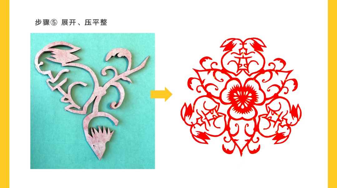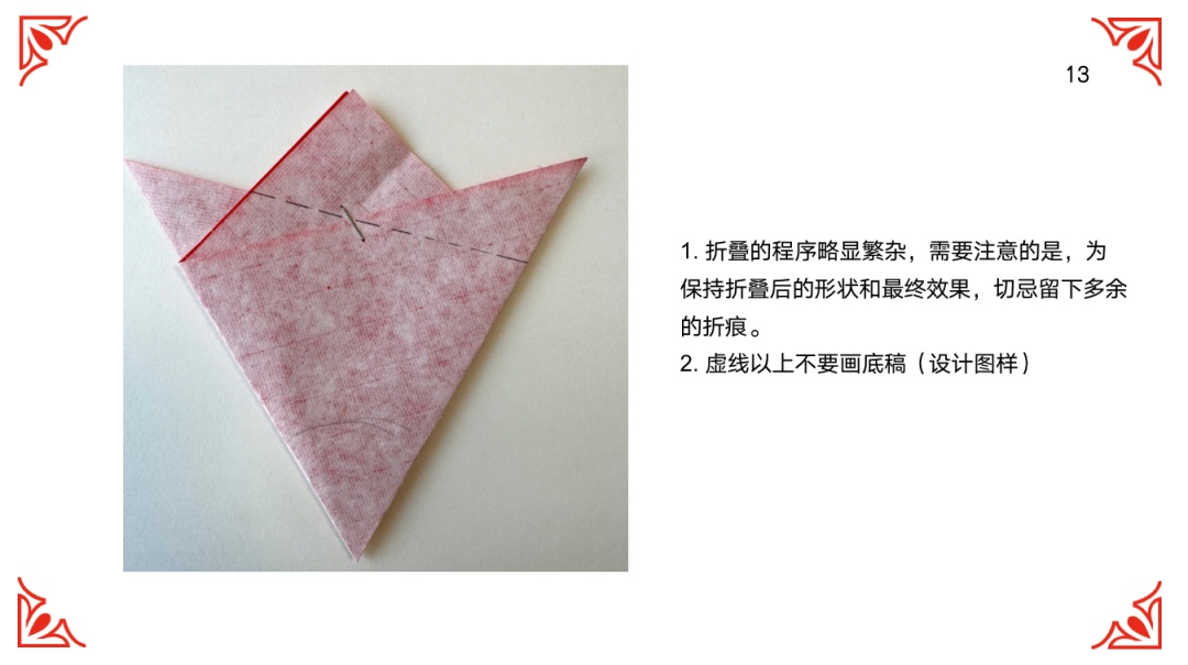 三折法以正方形对角线的交点为中心,进行六等分折叠,该设计方案适合有六朵花瓣的图案。本次设计有两两相对的图形、故以此进行设计转化。