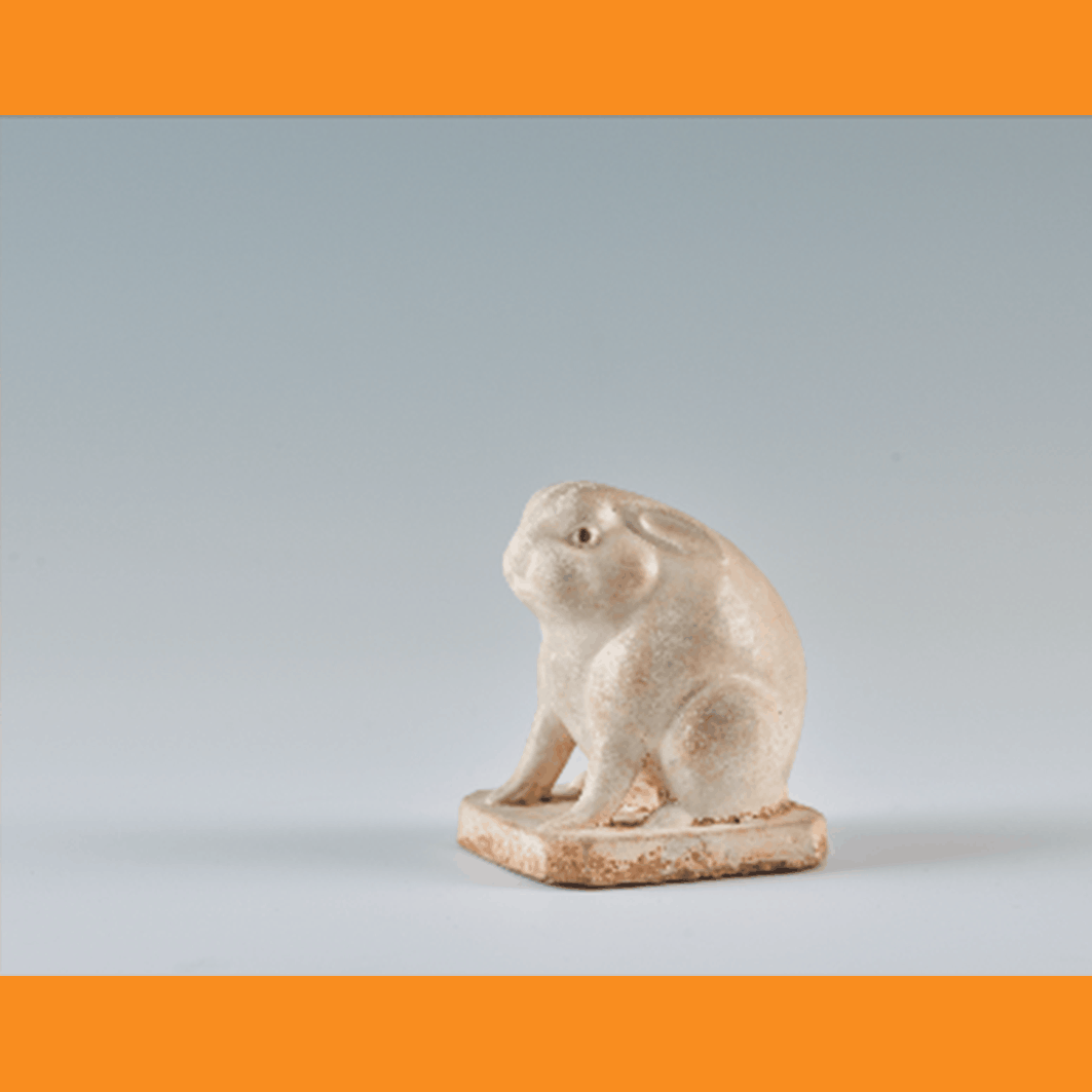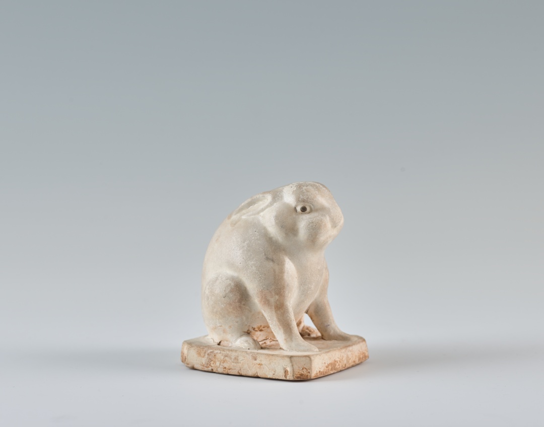 巩义黄冶窑窑址曾出土与之造型相近的素胎残件,结合胎釉特征判断此器当属巩义窑产品。类似的白釉兔还收藏于大英博物馆,此外,东京国立博物馆、瑞士玫茵堂还收藏有与馆藏此件头部造型略有差异的另一样式陶瓷兔,分别施蓝釉及白釉。