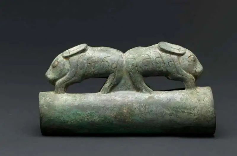 车衡通常为一根圆柱形的木棍,其主要功能是缚軛驾马。这件器物的主体呈空心圆筒状,用于插入木衡起到稳固和装饰的作用。双兔立于圆筒之上,作反向奔跑状,俯首曲肢,圆目长耳,臀部相连,腹部两侧装饰有云纹。
