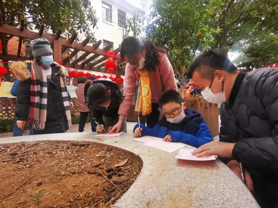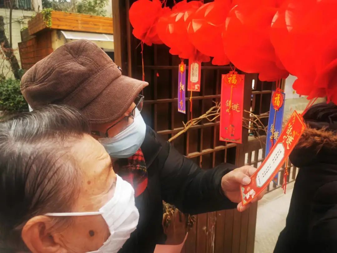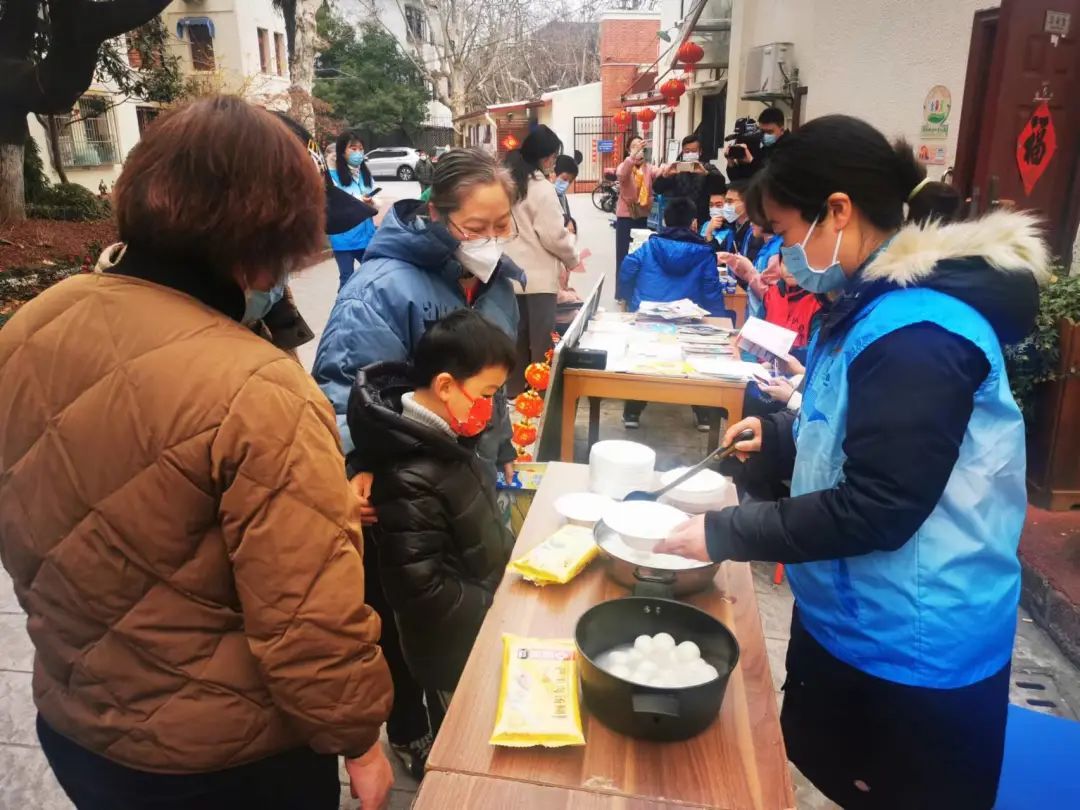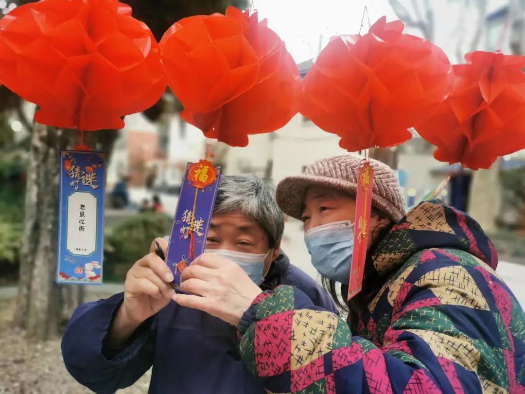 邻里小汇里,居委干部把一碗碗汤圆端进来,老人和孩子一起围桌品汤圆,甜蜜芝麻馅的,咸鲜鲜肉馅的,边吃边聊家常;室外绿地空间里,刚煮好的汤圆还冒着热气,分送给路过的居民;最热闹的还是围廊架下的猜灯谜。